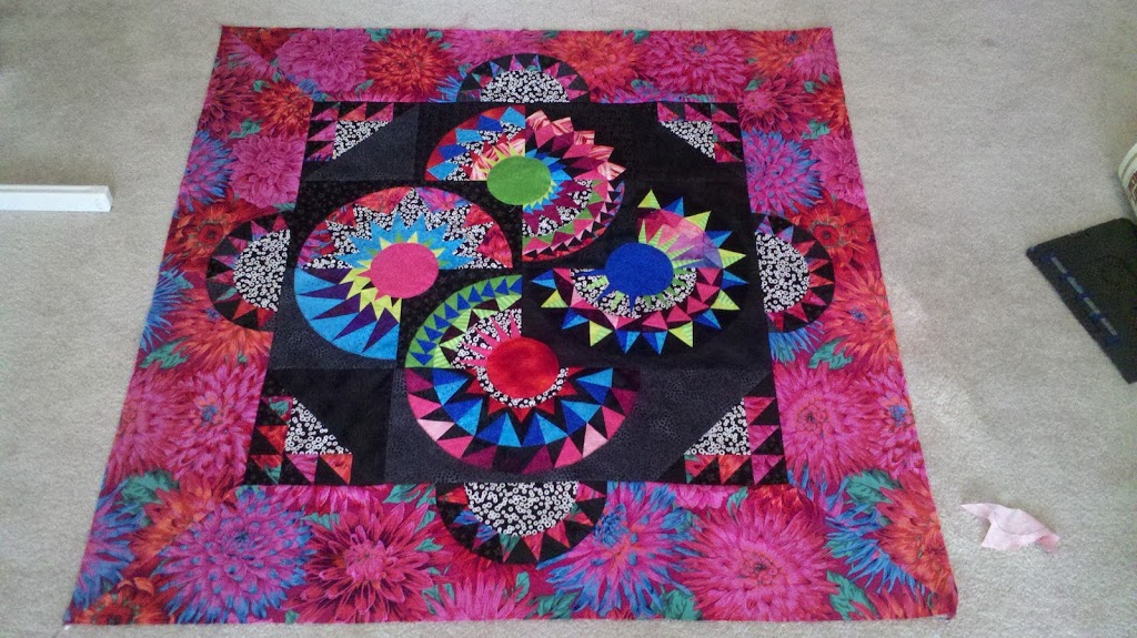 the New York Beauty blocks are from the book “beauty ‘n check” by Janice Ellertson and Jodel Yover, the setting and borders are my own design. This baby went to the quilter last week and I cannot wait to get it back! it is also my first quilt with a Kaffe fabric (the large floral border).