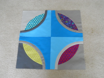 I will do the same on the other gray corner, add more colored pieces. I am thinking it might end up kind of like a double wedding ring. I will post the instructions for this add-on to the pickle on my tutorial page. I used the drunkards path template rulers and the curves go together slick-as-can-be!