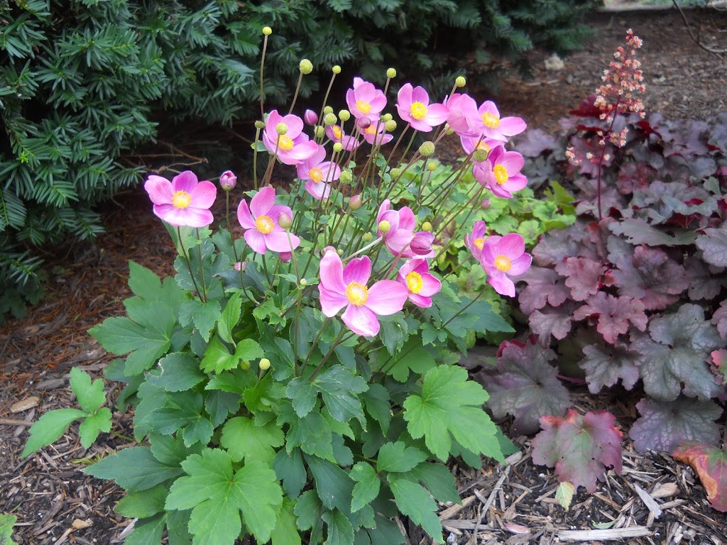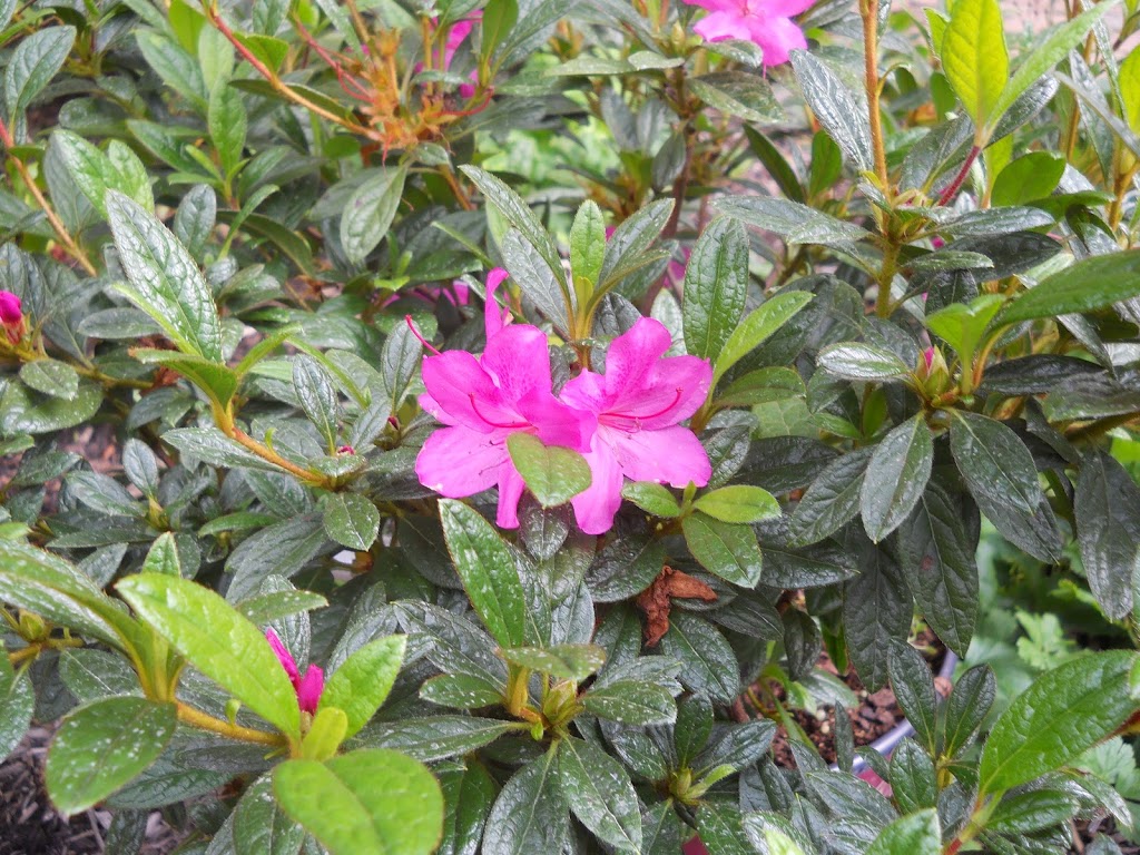 Azaleas in September!? this is Autumn Amethyst, the newest addition to my brood, compulsively purchased on Thursday on the way to work. How can I resist an azalea that claims to re-bloom, has gorgeous purple/pink flowers, and promises fall/winter foliage? I am powerless.