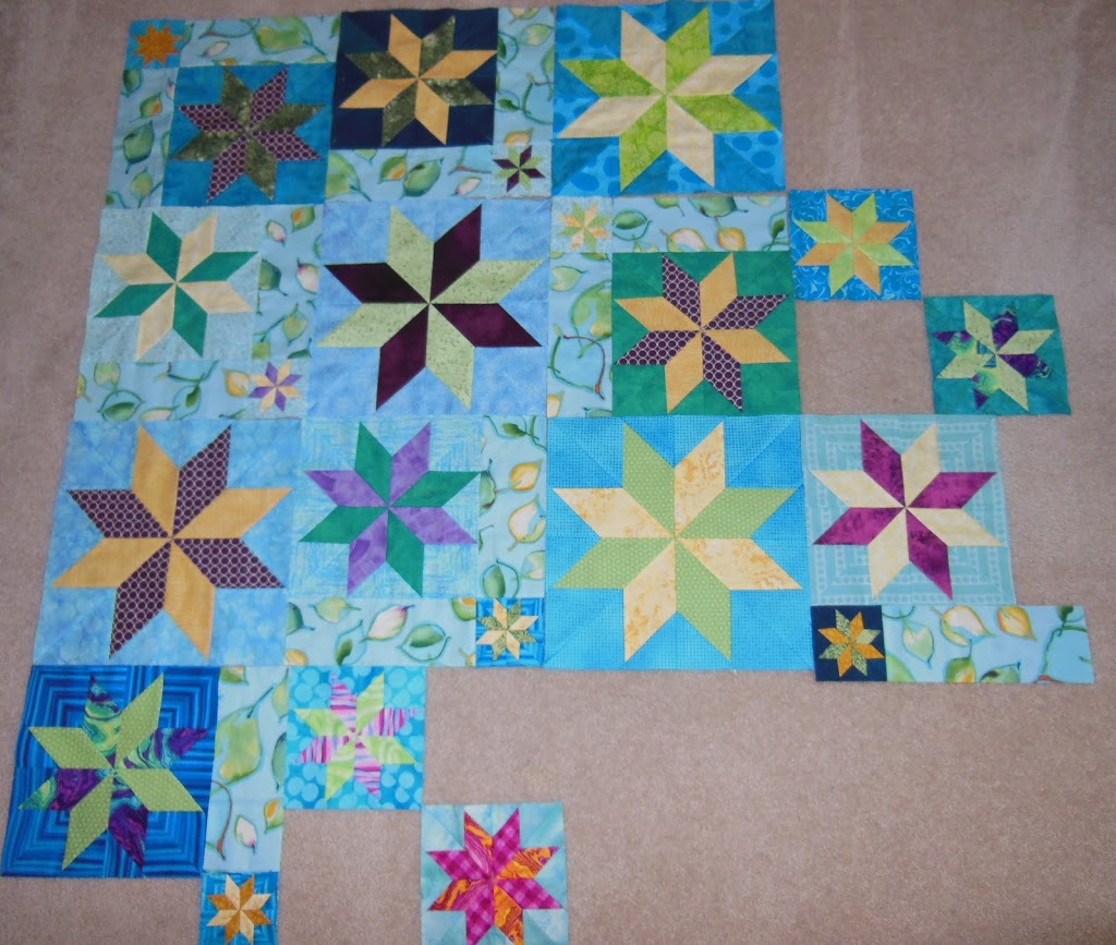 I took the palette and started making stars in four sizes (yes, there might be something wrong with me), 12″, 9″, 6″ and 3″. I planned on using the leaf fabric to piece them all up to 12″ blocks then put them together.