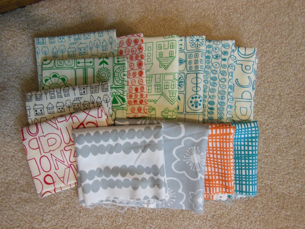 I bought the Summersville (Moda, Spring 2012) fabrics last spring, but I just picked up the Bella ones (bottom four, gray, orange, blue). I think they coordinate well, think I will try to collect some more. I like that they have more color, less white. The Summersville have so much white, not sure how to use them, maybe adding the Bella prints with more color will help. Any suggestions?