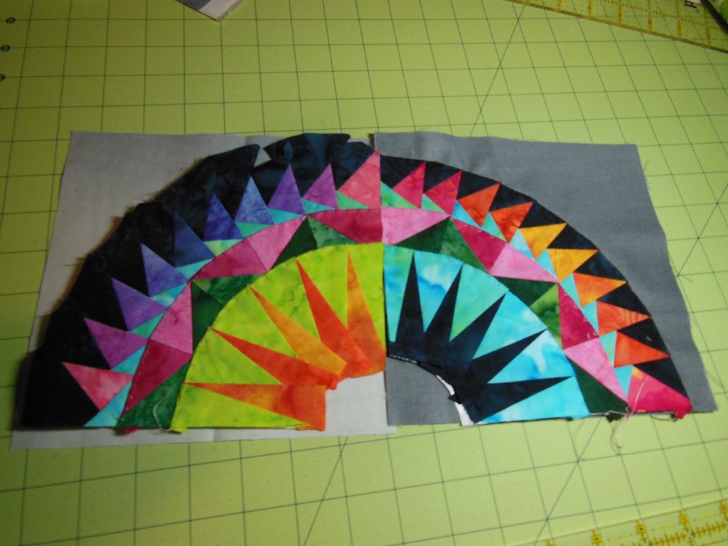 The block on the right is all stitched down to the background. I decided to use the gray ombre solid from the new collection “simply color” for my backgrounds. Going to cut out squares across the color spectrum, mix them up and then sew them back together for the background of the NY Beauty pieces.