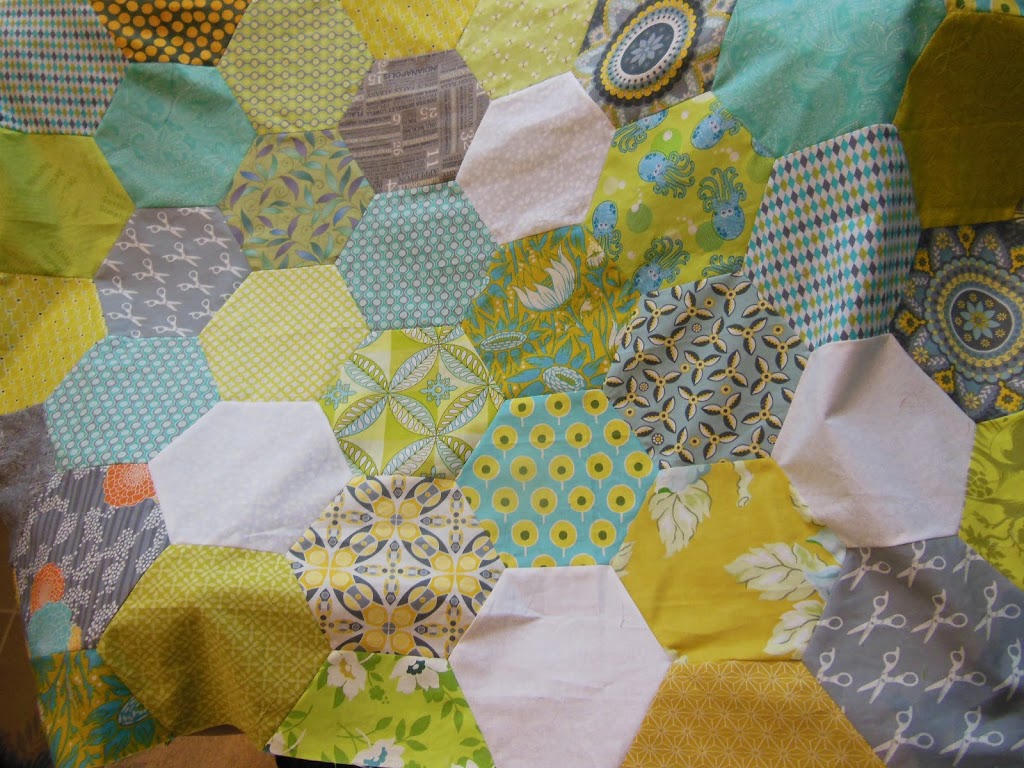 Love the turquoise, lime and gray combination in your mom’s hexi quilt top. I never caught the hexi bug when it first went around, but I think the larger ones are something I could get into. Meanwhile, I will admire yours and your mom’s!