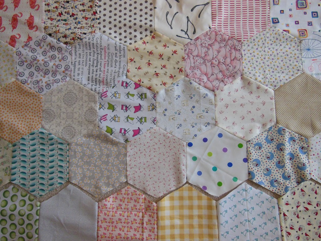 Look closely at how cute these prints are, such a great variety! (do you see the one with bras in the top picture?) She has made a twin size charm quilt! The hexagons are about six inches and machine pieced.
