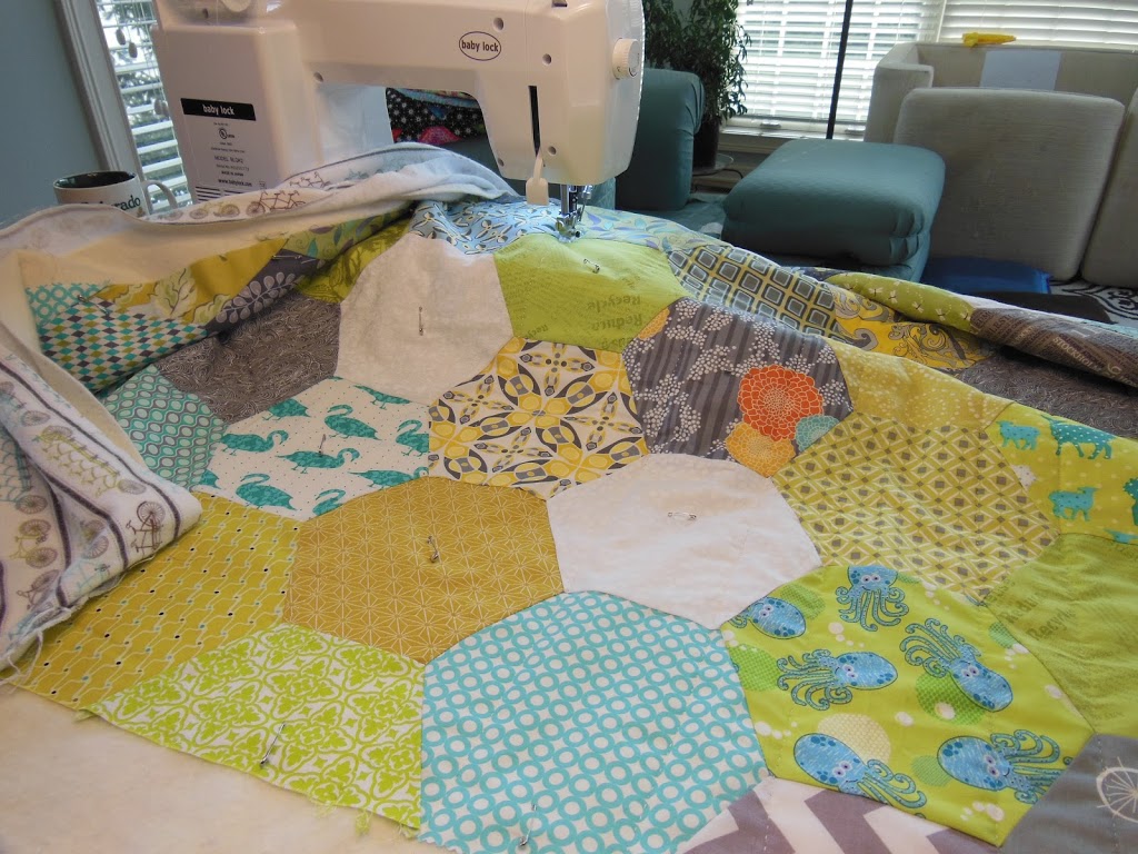 Quilting on my Mom’s hexi quilt. coming along nicely. hoping to finish this week and get it turned in to the quilt shop for display. I am going to teach this as a class in May. Don’t mind the deconstructed furniture in the back of the photo: that is the makings of a pirate ship.