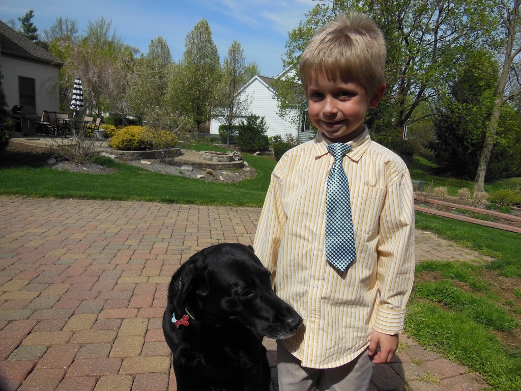 My little professor (with Cleo), his first time in a tie! do you love how he clipped it on on the outside of his shirt collar? he kept saying he felt like the President. ha ha ha!