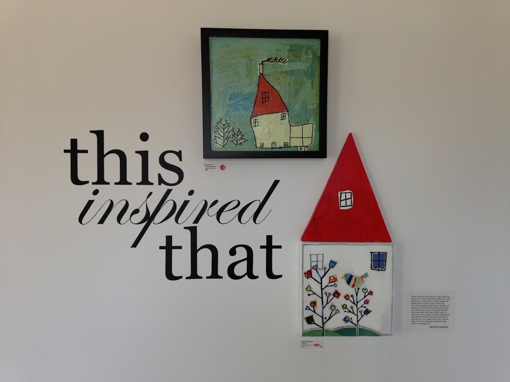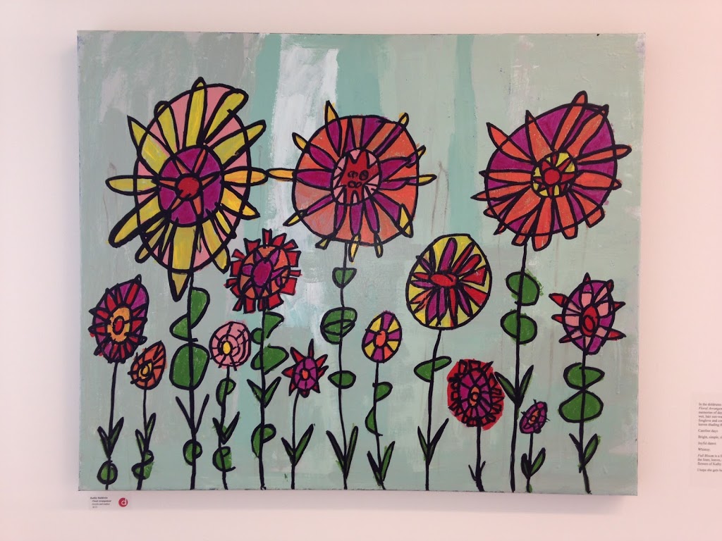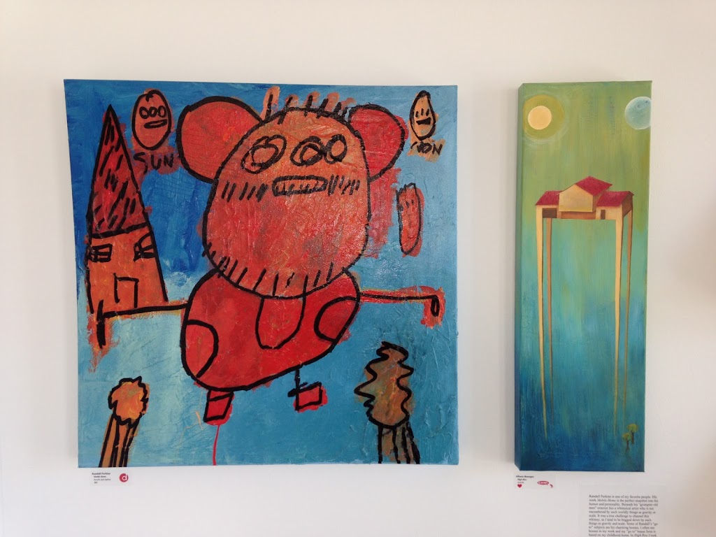 Open Door Art Studio provides space for artists with physical or mental challenges to create artworks. The current display, “this inspired that”, was created when professional artists made a creation based on a piece by a participant at Open Door. I really had to resist with all my will not to buy that house at the top with the little heart vines and bird. And those flowers in the painting above….! love.