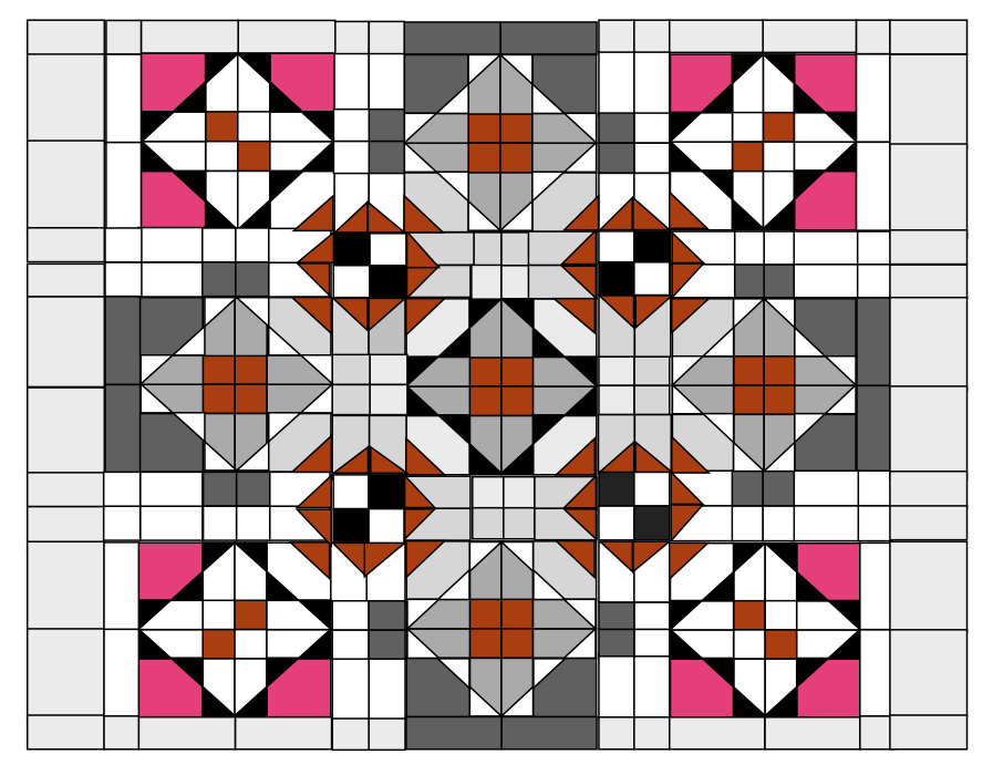 I was playing around with this on the computer, making one with red, white and black…and noticed that using different color placement creates some different designs. This was what I came up with: