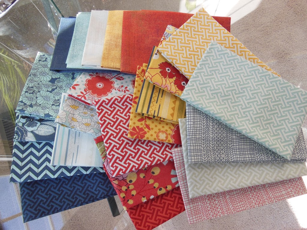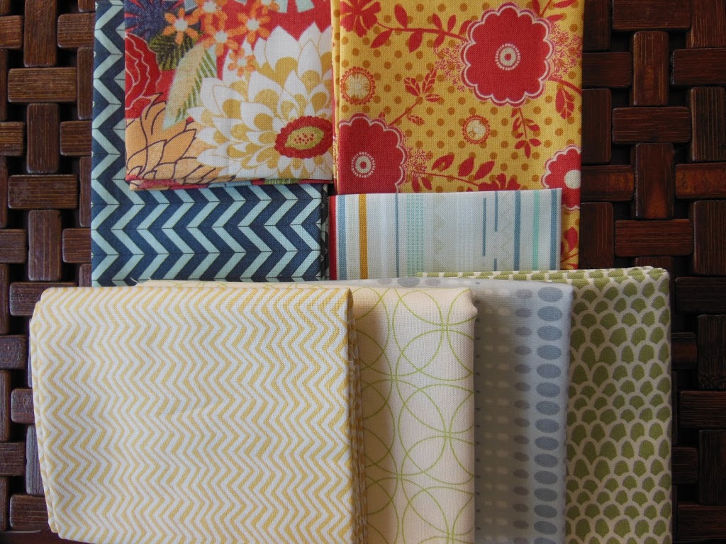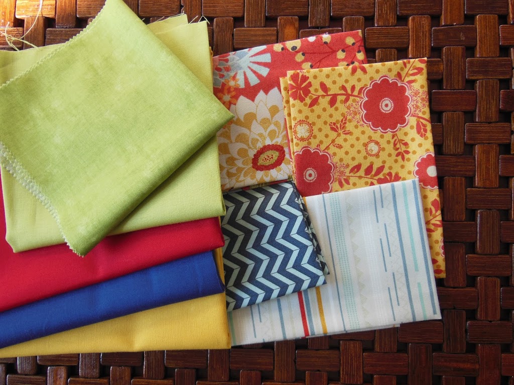linen/cotton blend in natural, a blue shot cotton, and gray, red, blue pieces from the Mod Century fabric collection. I like these because they read as solid but also add Texture and bit of Brightness.