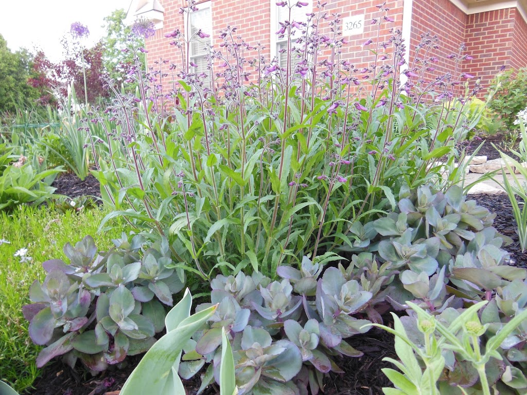 I am liking this combination of penstemon (the airy tall plant) and the “Xenox” sedum around the base. The Penstemon will have lovely purply and white flowers on those stems in a few days…you can see the purple forming at the top. The sedums’ purply gray cast are a perfect compliment in both color and texture.