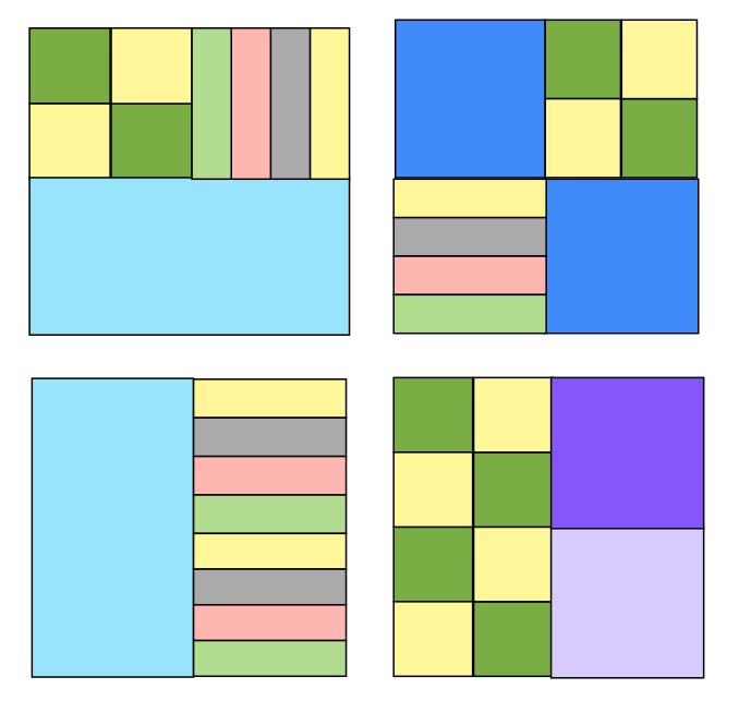 When you are piecing the blocks, think of each one as a giant 4-patch where each of the 4 squares contain different pieced units or solid squares/rectangles of fabric.