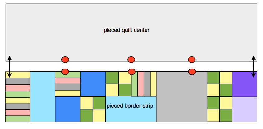 5. Lay the border strip alongside the pieced quilt center. Measure the center point of both, as well as the half-way points between center and edge, as shown below (red dots)