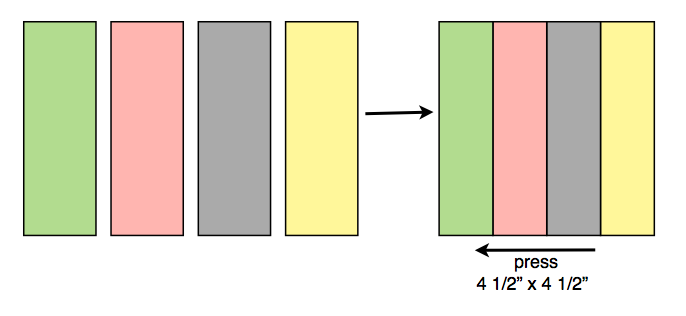 - sew the strips together along long edges to form one unit (should measure 4 1/2″ square)