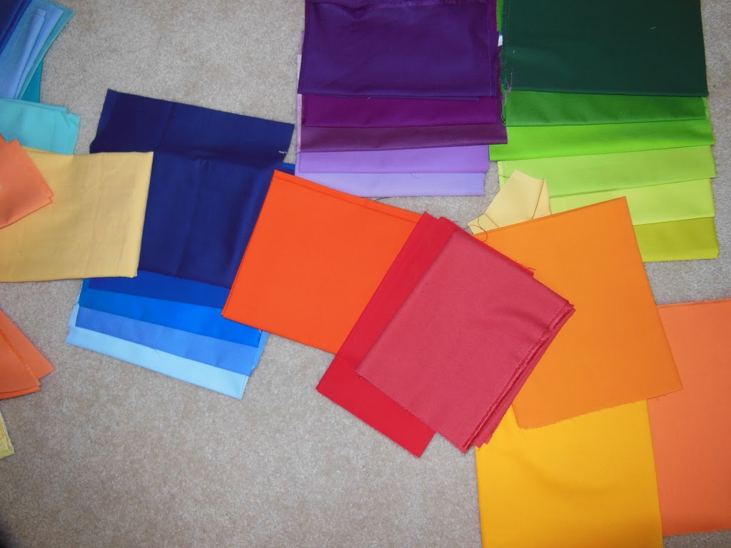 I really wanted to make a kind of monochromatic quilt with gray fabrics I have been collecting. Then I had the idea to add in some really bright solid colors. I am sorting the solids in rainbow color groups and in groups from light to dark. Don’t those look so pretty?