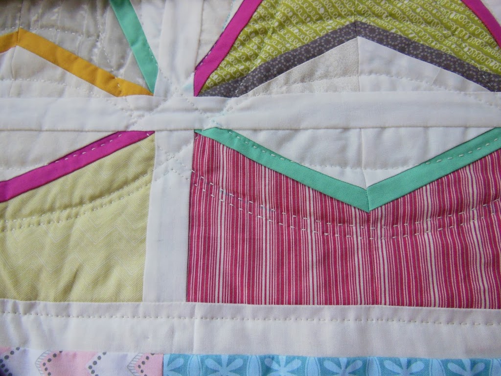 This is the most ambitious quilting project I have done yet. I actually marked (with a water-soluble pen) a double wedding ring design on my Noteworthy quilt and I am quilting it with my Sashiko. Above is a close-up, so you can kind of see the stitches. I am pretty happy with it even though it is far from perfect.