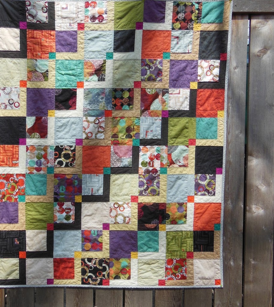 I made this version with the collection “juggling summer” by Zen Chic for Moda. The prints are equivalent to a layer cake. For this one, the sashing strips are four different neutral fabrics set to make the zig zag pattern with a variety of bright solid scraps as the accent squares.