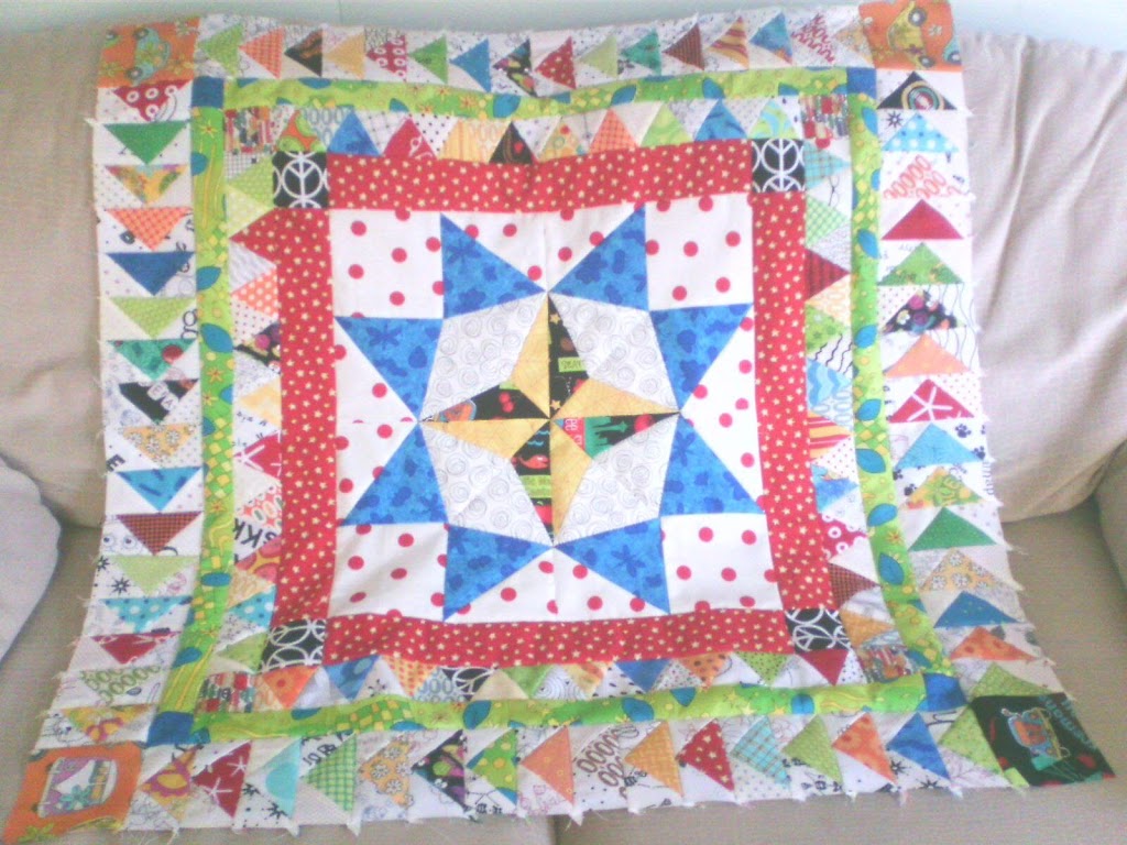 My mom and I had talked about doing this together as a long-distance sew along. She started first and already has me lapped. Here is the start of hers, medallion along with some borders added: