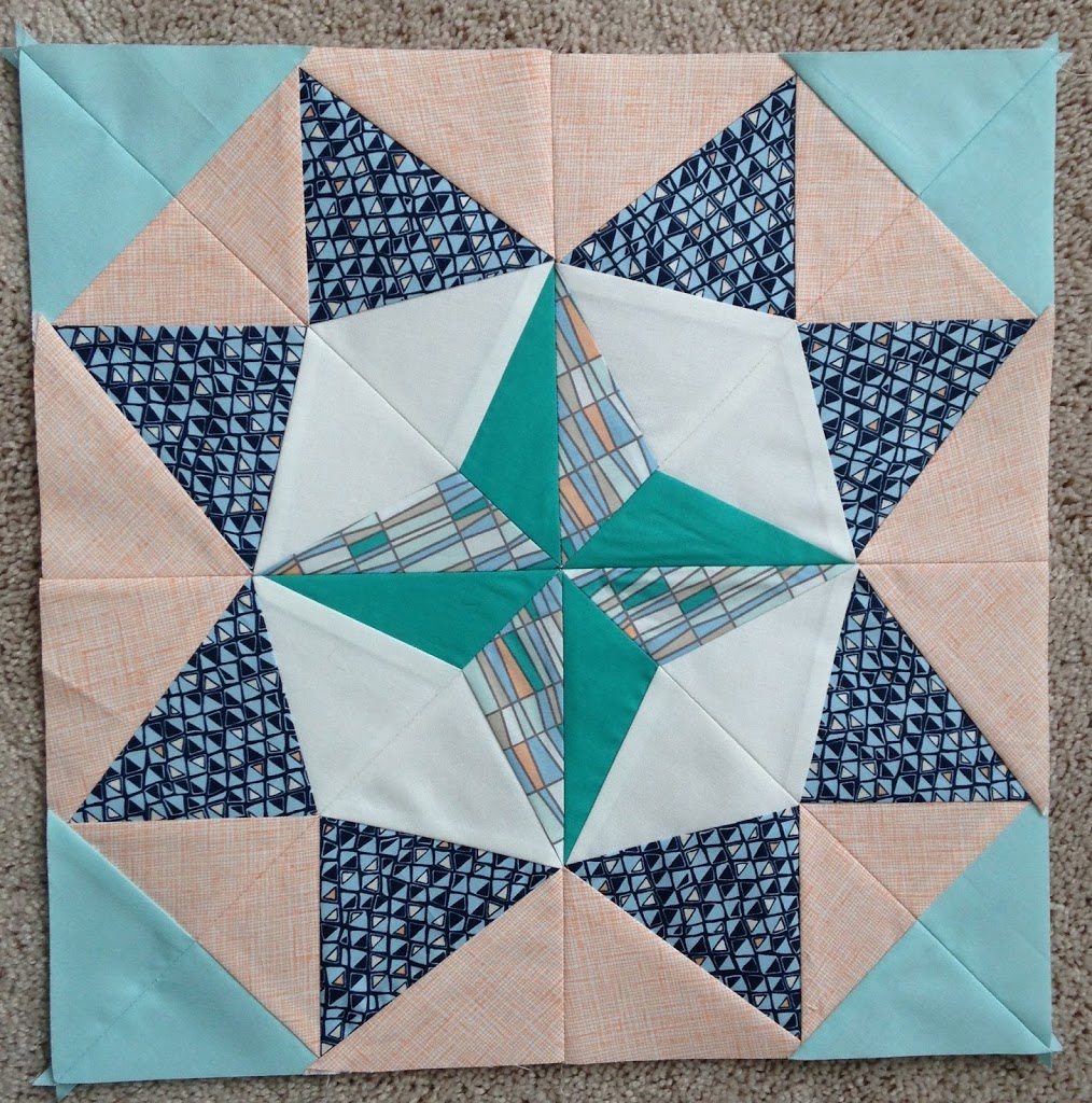 I am using primarily a palette of navy, aqua, gray and white with touches of the peach. I was lucky to get a piece of this peach crosshatch fabric (part of the Architextures collection) at my local shop and it is the perfect color. The other two prints you see in my block are from the Indian Summer fabric collection from Art Gallery (the online shop Stash Modern Fabrics has a fantastic selection of these as well as my other current favorite, Urban Mod).