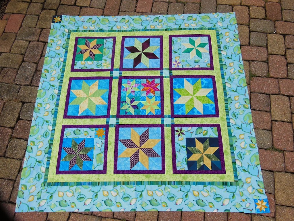 Here is my finished top, it measures 64″ square. I had two 3″ star blocks left over that I added to the corners of the border, just for fun!