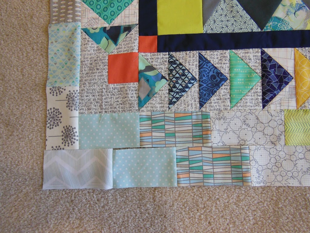 Match the strips back up with the sides that they were cut from, each rectangle should be off-set from the first border, creating the “brick” effect. Sew the two opposite sides on starting with the 11 rectangle strip. Press, then add the two 12 rectangle strips to the final two sides.