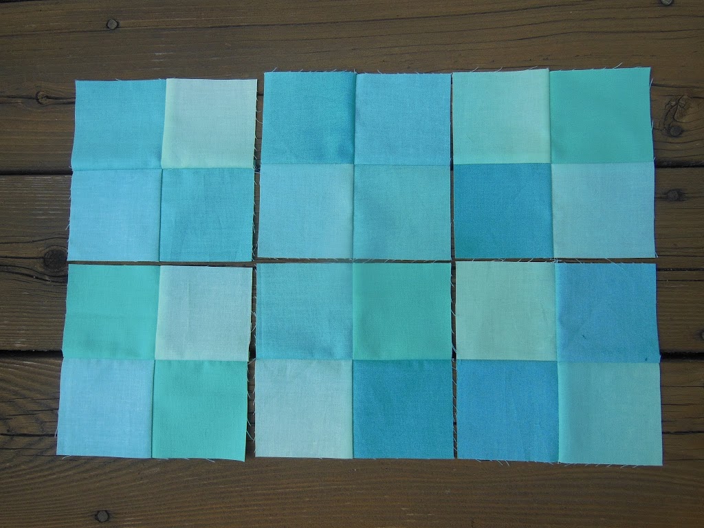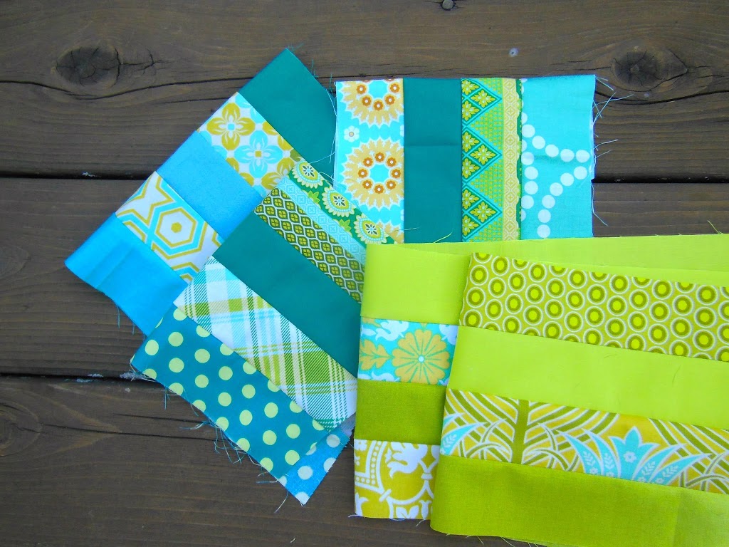 In keeping with the traditional wedding ring pattern where the rings are made up of pieced segments of fabric, I am making these strip sets in blue and green for the arcs of the rings. This is another “plunge right in” and see where it goes kind of project…Hope it works out how I imagine!
