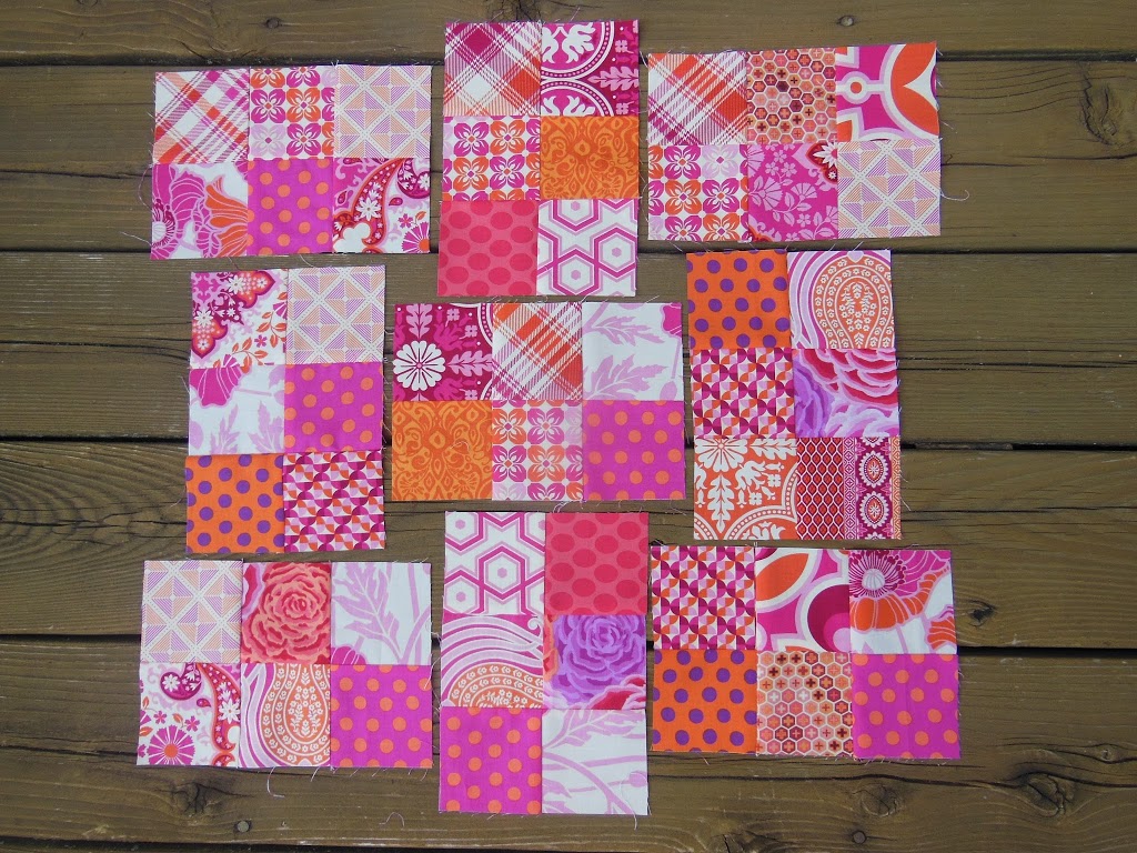 I am “making” fabric….the solid blues at the top will the insides of the rings and the hot pink and orange patchwork will be the borders. I am using my Notting Hill fat eighth bundle along with lots of prints and solids from my stash.