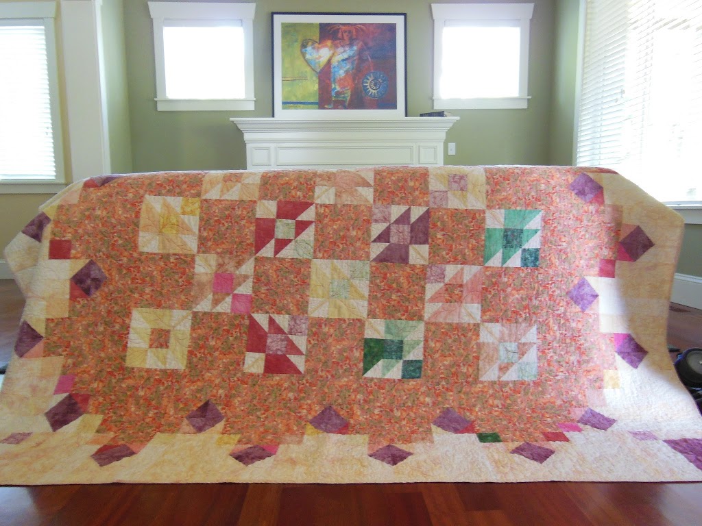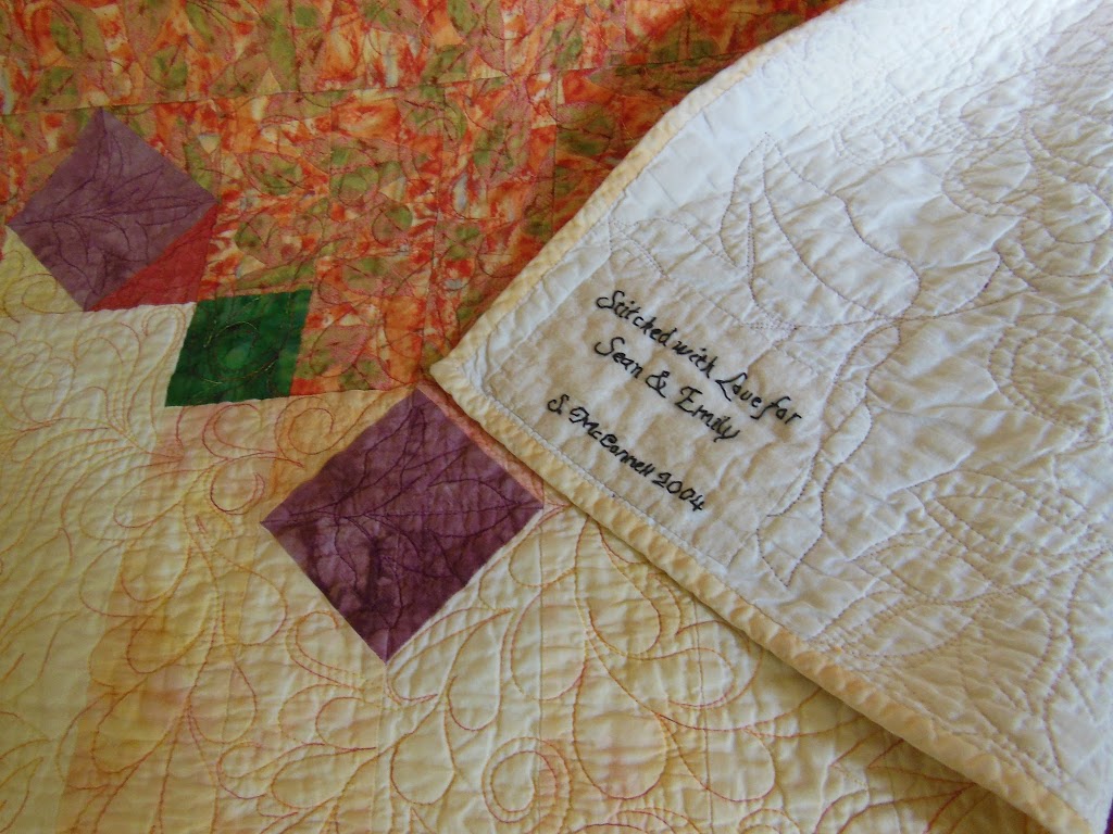Last month when I visited my sister in Seattle, I got to revisit this quilt that I made for her and Sean (my BIL) back in 2004. The leaves were pieced with hand-dyed fabrics in solid colors, with bits of batiks mixed in.