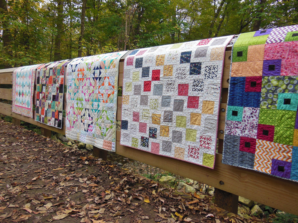 I have been playing around with photographing my quilts lately. I am the wacky lady carrying “blankets” around and taking pictures of them in nature. Cleo enjoys chasing squirrels while we are on these outings.