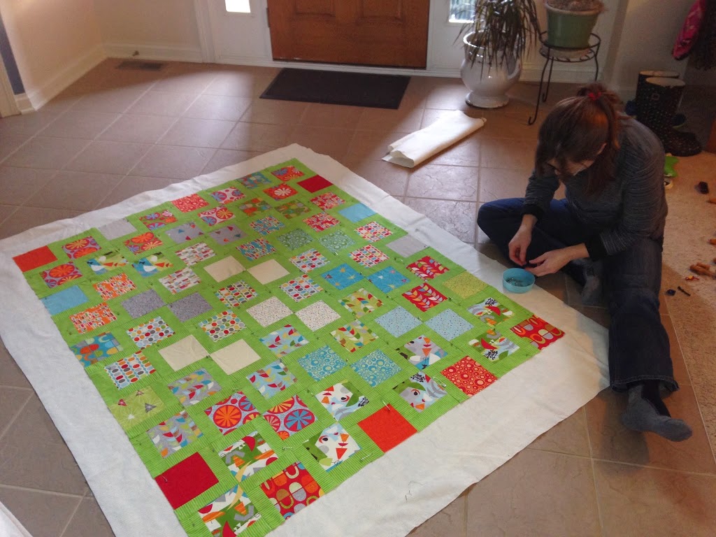 It is Sunday and that usually means that my friend Rissa comes over to sew with me. I wrote previously about her working on her first quilt…and she has finished the top! Today I showed her how to baste it to get ready for quilting.