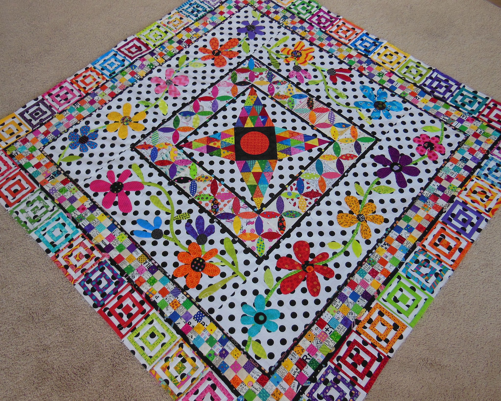 As you can see, Mom decided not to do the tiny churn dash blocks. Instead, she widened the appliqué flower border and redesigned it to her taste: big, bright and splashy! There really are lots of options with sampler-style quilts, you can make yours like the pattern, or just how you like. Isn’t this fun with all the bright color?