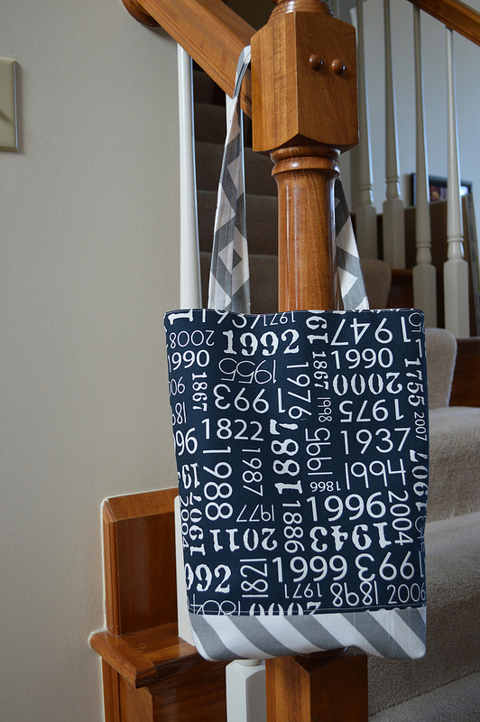 I am in love with it, the fabric is kind of like twill, so heavier than quilting cotton and lined with white fabric. And guess what? the zig-zags on the handles actually line up when the handles are placed together (I am going to claim that I did that on purpose).