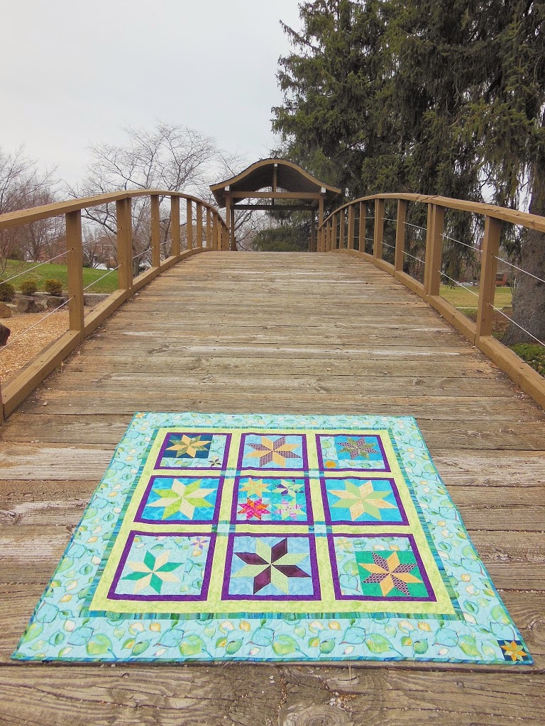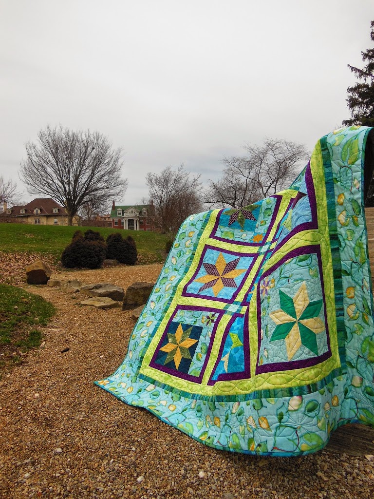 A couple of years ago, I made these Lemoyne star blocks using gold, purple and minty green inspired by the colors in the leafy border fabric. I made several in 3″, 6″, 9″ and 12″ blocks without any plan for a quilt, and then they sat in WIP-land for a long time. Last Summer I finally decided to just make what blocks I had into a quilt, and this is the result.