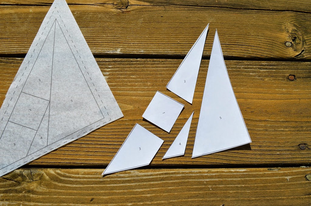 Cut out your piecing templates (that’s mine above on the left). Cut out the extra template you copied on regular paper, but cut out all the pieces, right on the lines (shown above, right).