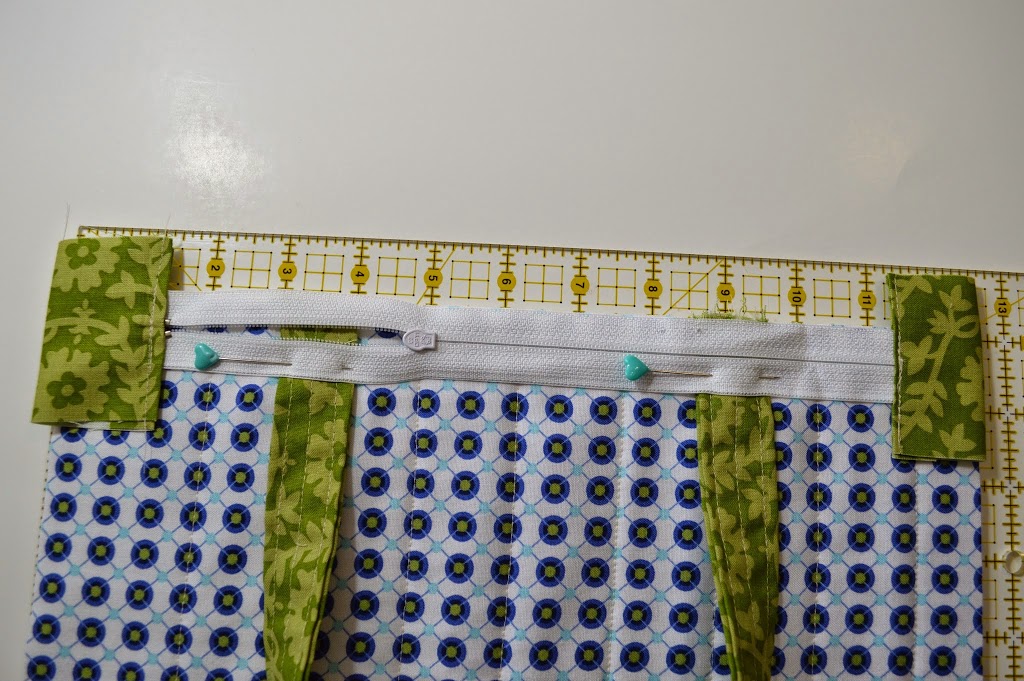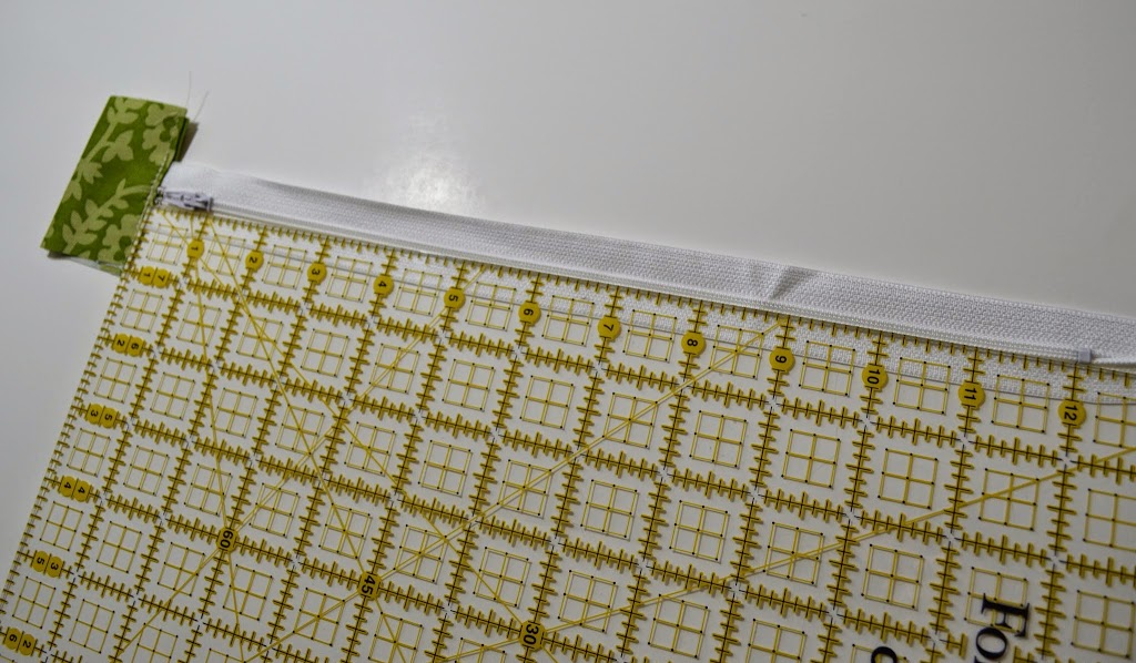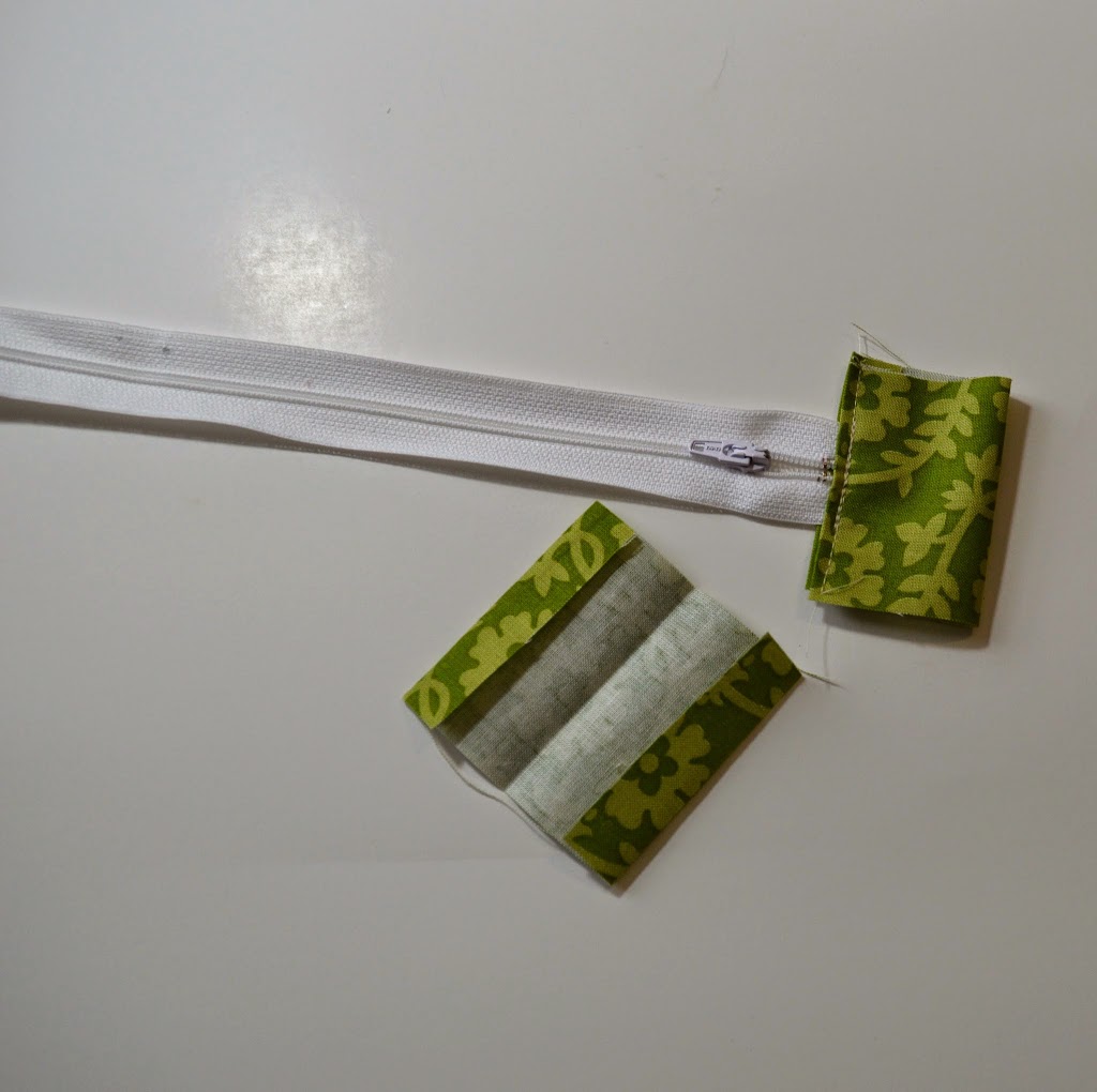 Re-fold at center crease and place over the starting end of the zipper. Carefully stitch across the tab, backstitching directly over the zipper to secure.