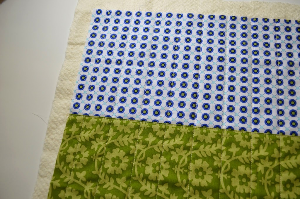 2. Place the fabric panel made in step one on a scrap of batting. Quilt with straight lines running perpendicular to the seam between the fabrics. Topstitch along the seam on the accent fabric.