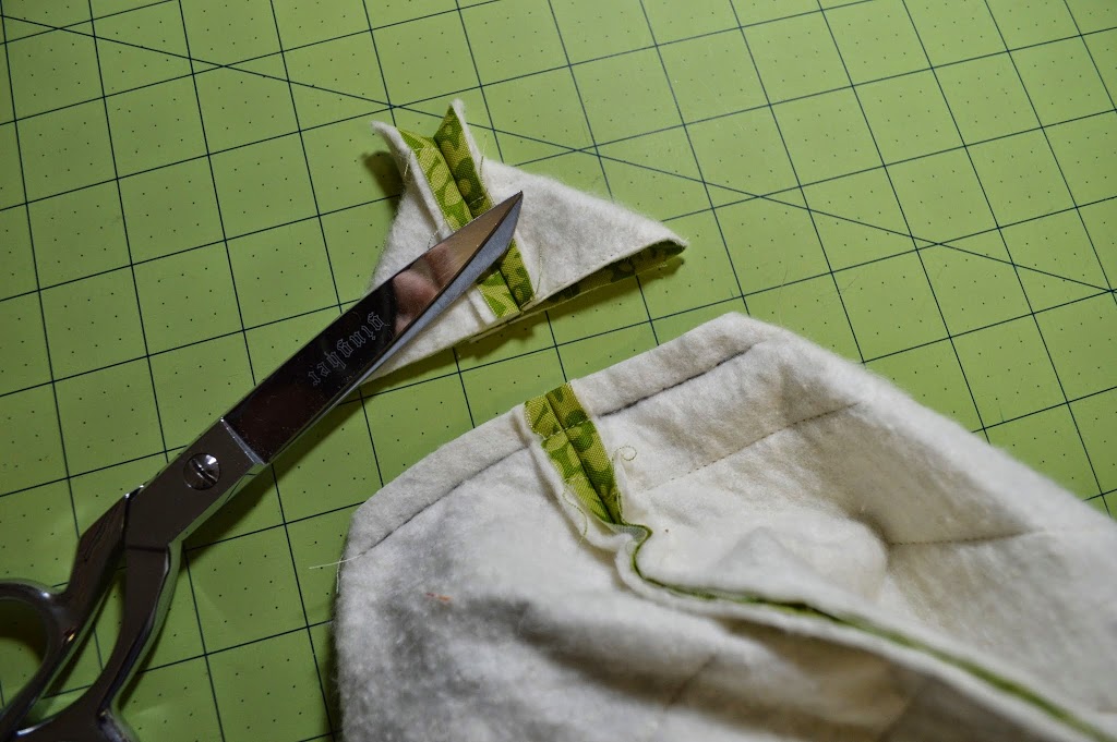 15. repeat steps 13-14 on all four corners (outer tote and lining). Then turn right sides out through the opening left in the bottom of the lining.