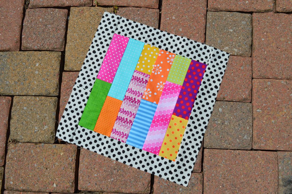 Some quilts pose a challenge in choosing the binding. One of these is my second Polka Dot Bikini quilt (shown in photo at top). The reason this one felt tricky is that the edge of the quilt isn’t consistent: some areas of the edge are solid blues and some are pieces with blue, orange and green. There wasn’t a clear choice: a blue would blend in some places but stand out against the patchwork, and a print might look funny against the solid blues. In the end, I chose the small-scale orange stripe. I like how it blends with the patchwork, but doesn’t seem too jarring next to the solid blues. It also helps that blue and orange is my favorite complimentary color combo!