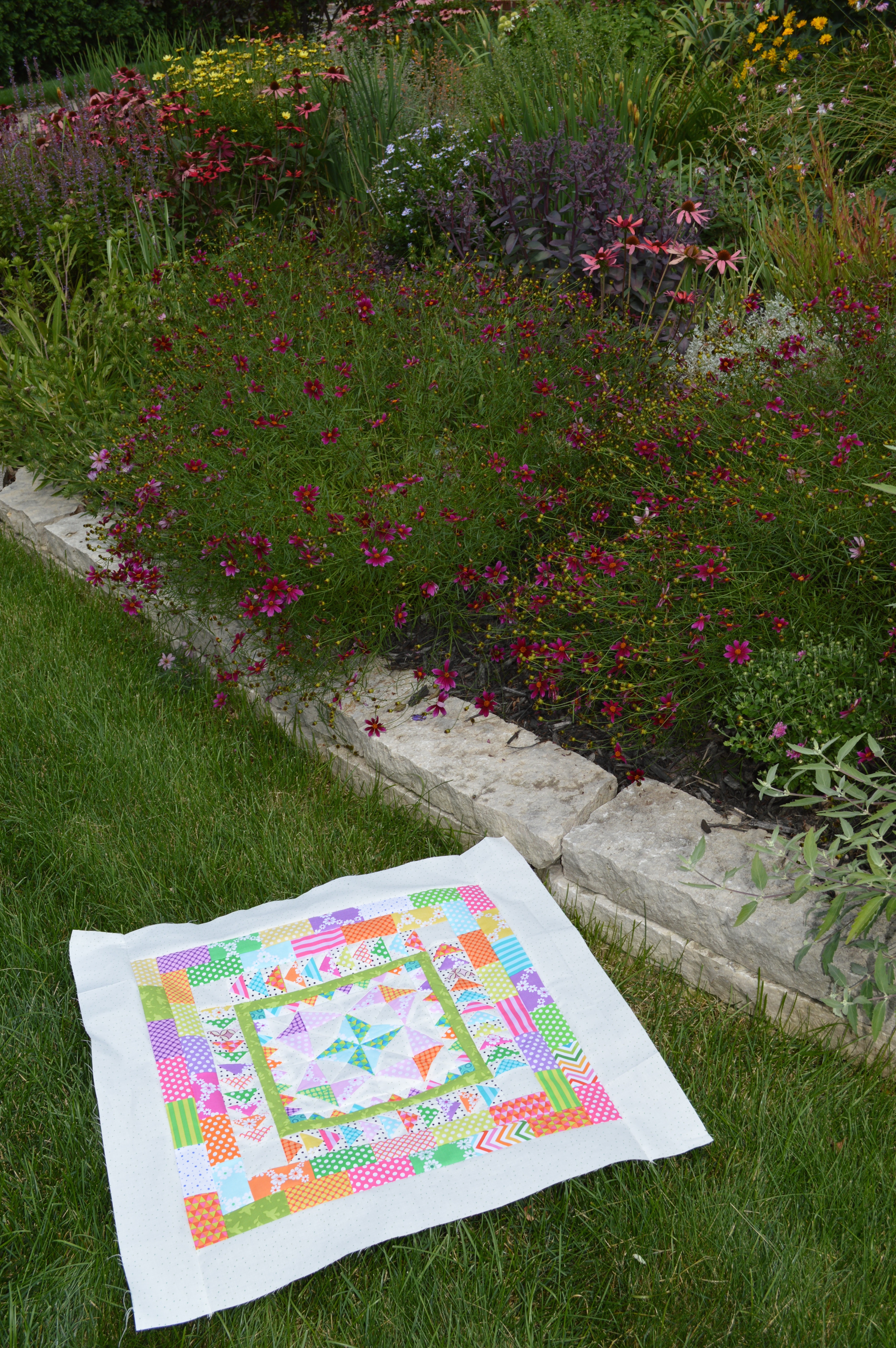 In my quest to spend July on my Works in Progress, I have made a little progress on my Mini Marcelle Medallion quilt. I have added the brick-like rectangle border and the solid fabric border, which is white with tiny green dots. I am really happy with how this is coming along: the colors are so cheerful and sweet, and there is just something fun about a tiny quilt. At this stage, it’s not too tiny anymore, about 27″ square.