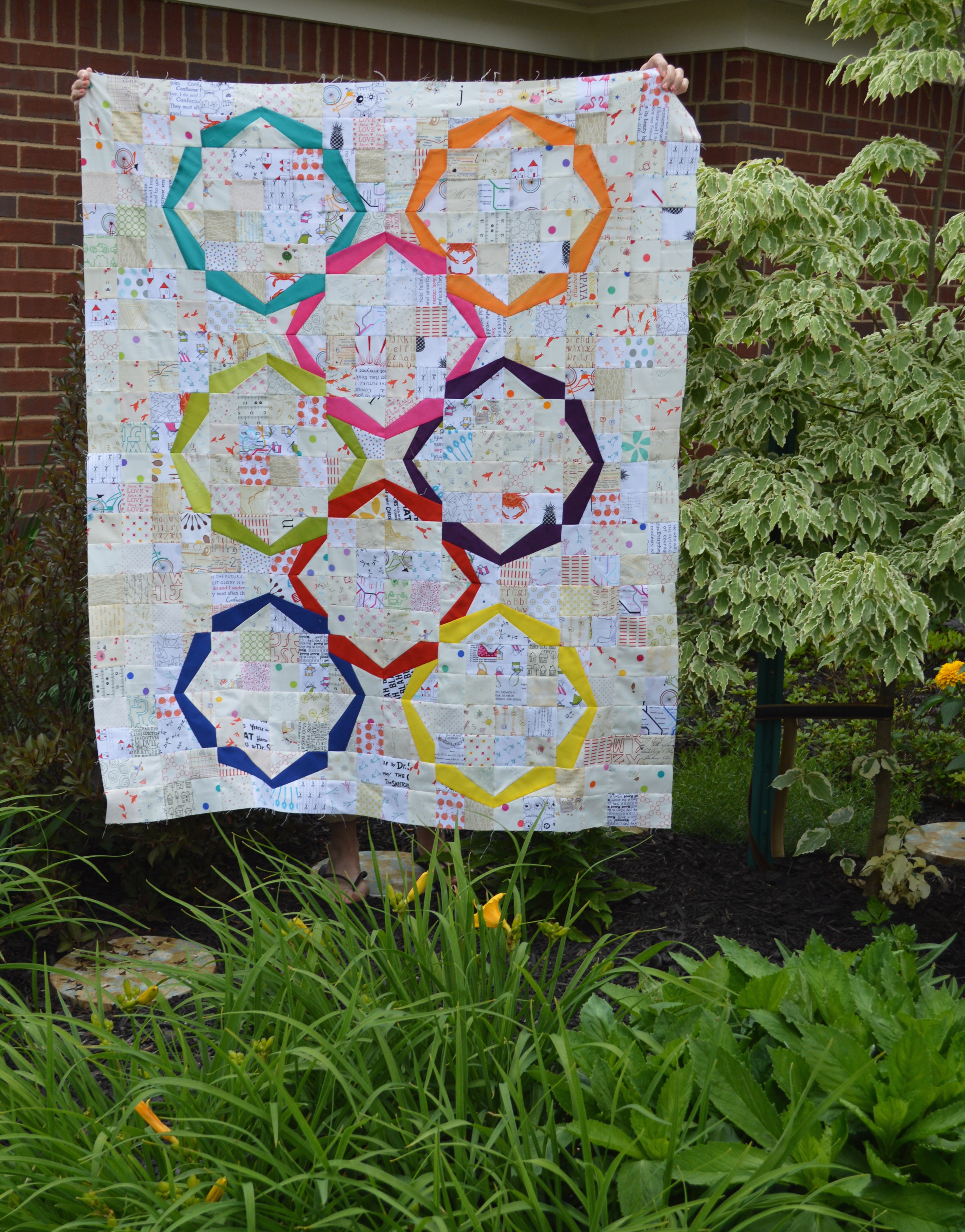 I love this quilt! I feel like it’s okay to gush a bit because I didn’t actually make it. This is variation on my modern wedding ring quilt that I designed and made for the NY Modern Quilt Guild challenge last fall.