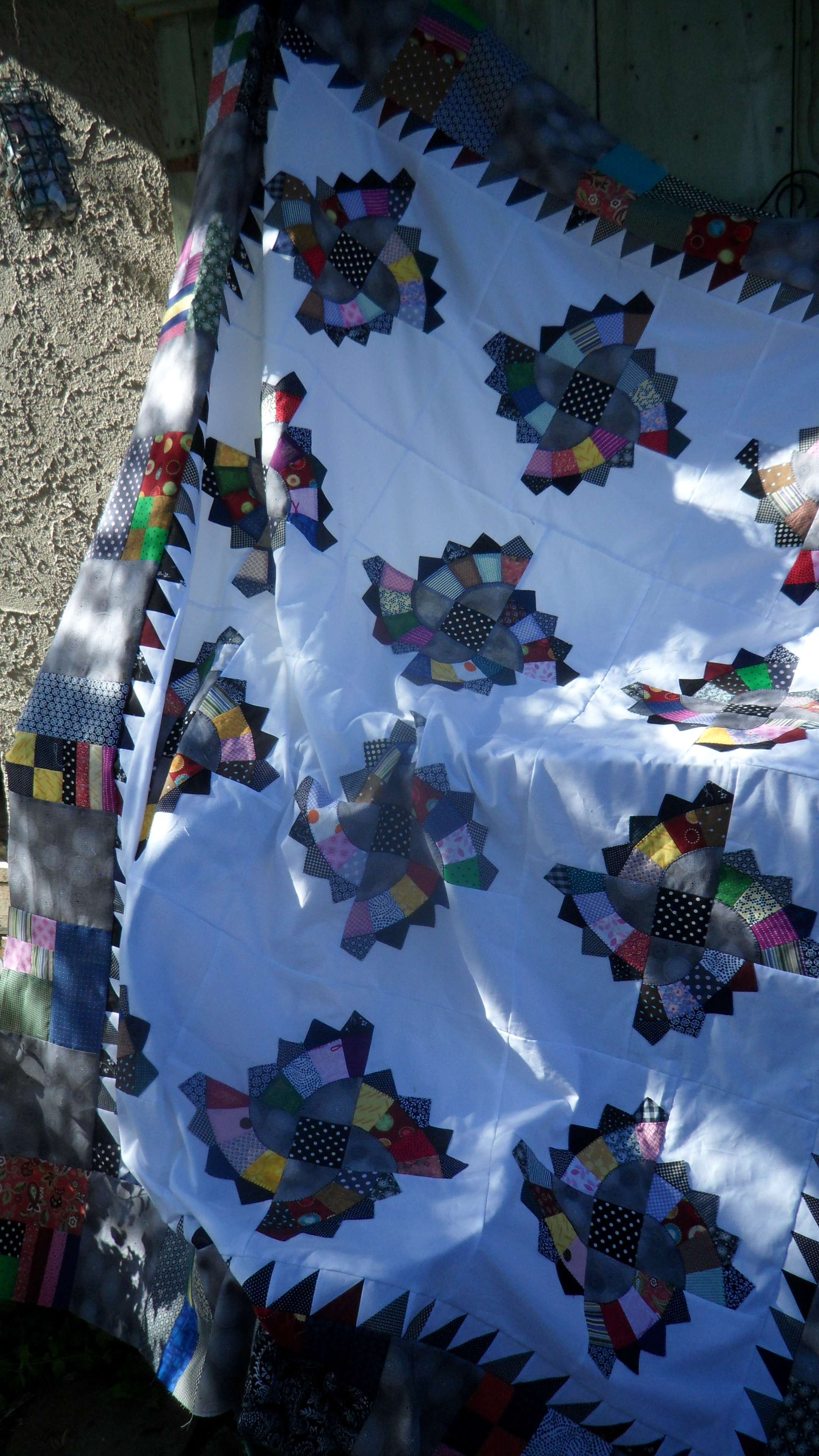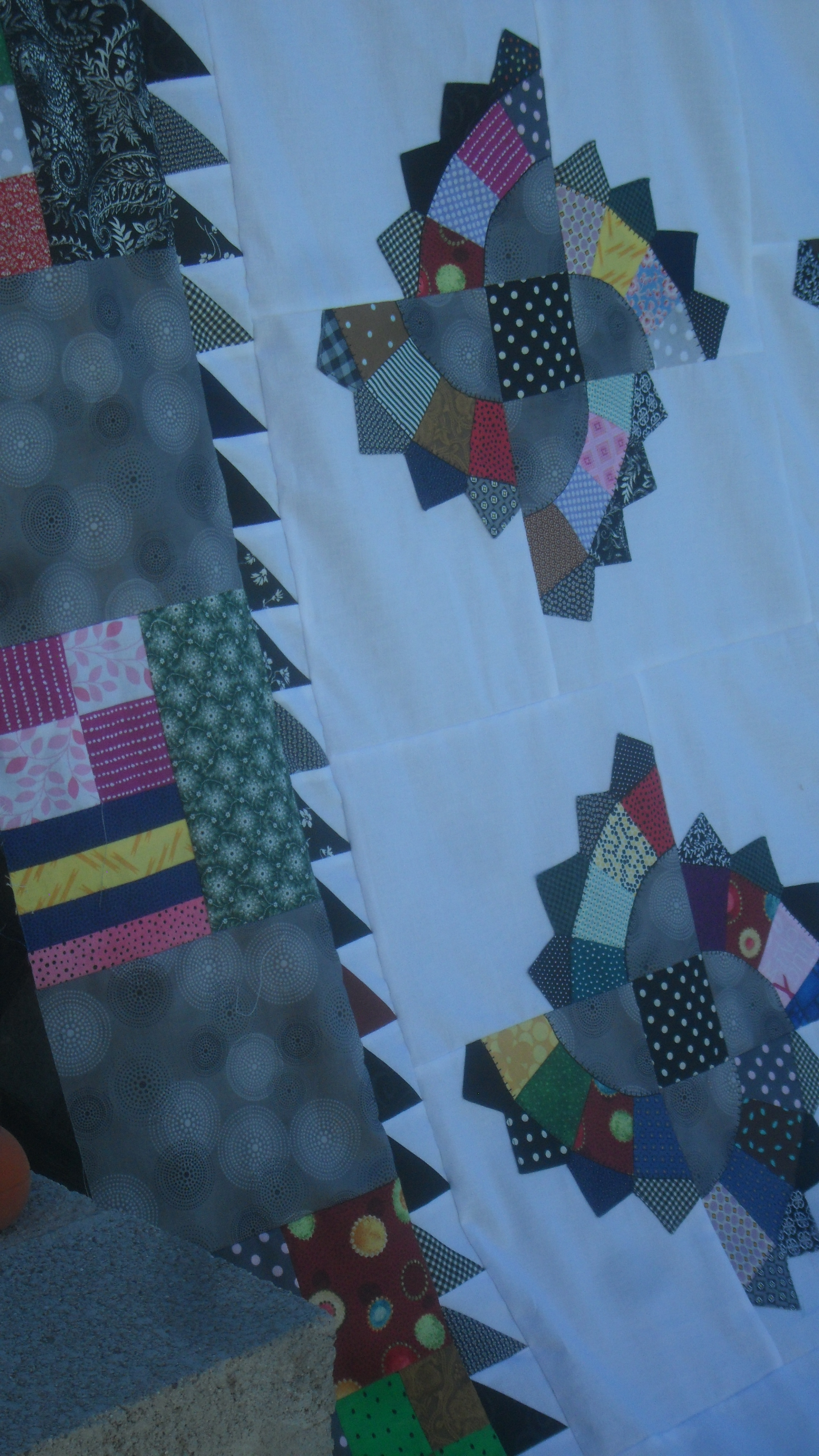 One of the things Letha says she likes best about her Twirling Fans quilt is the way the black looks as the arcs of the fans and the polka dot in the centers of the blocks. I really like all the scrappy fabrics she used and her pieced borders. She did a really great job!