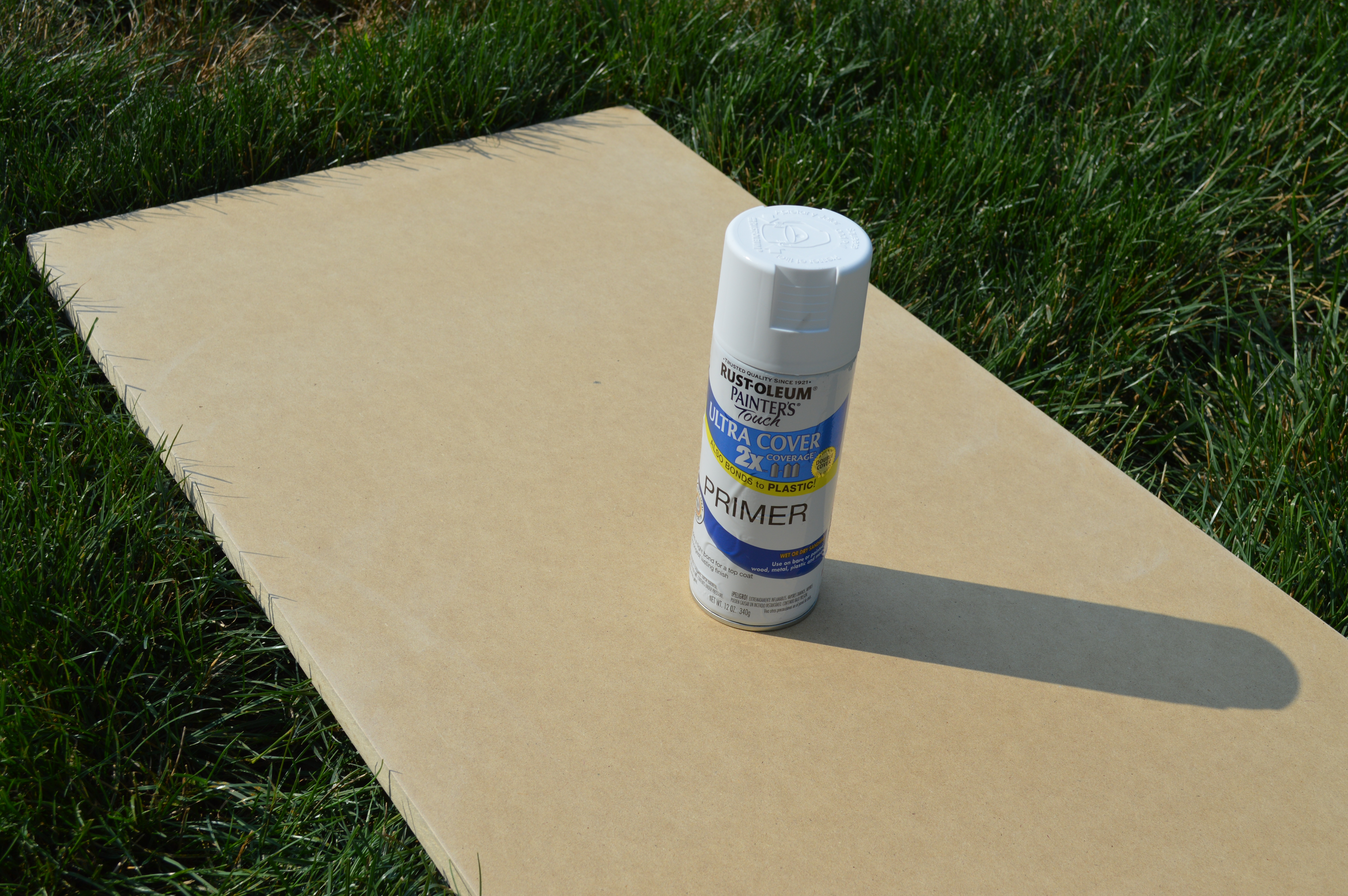 The lovely people at the Home Depot will cut wood down to size for you for free. I bought a piece of particle board and had it cut to 18″ x 32″, perfect for my table opening. I sprayed it with white primer. Then I painted it white with some paint I had left over from painting my sewing room walls. Now comes the fun part: