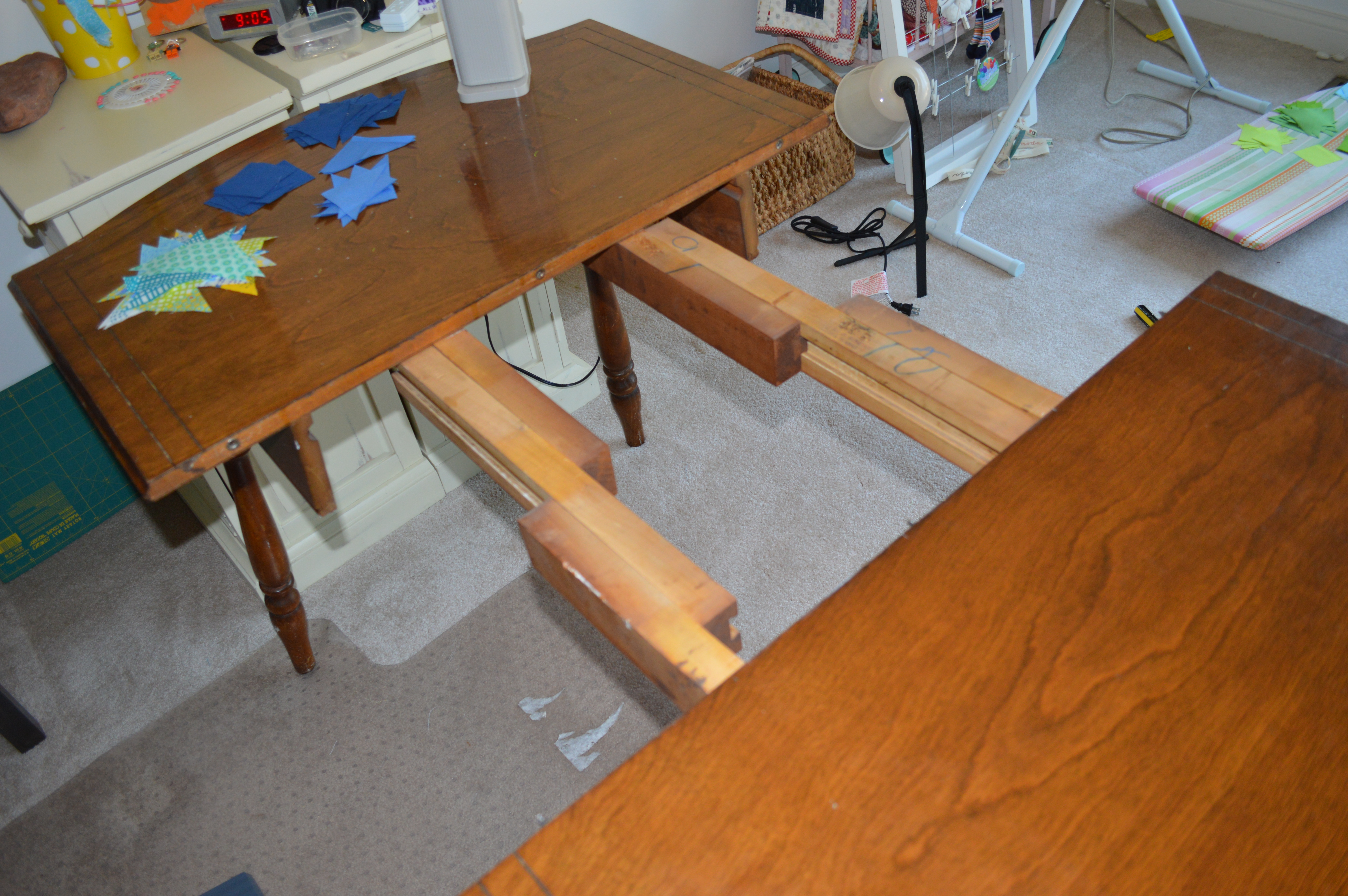 For my sewing machine, I am using an old table we used in our dining room in our first couple of pads, and my husband once inherited from his parents. Unfortunately, the leaf was ruined when we lived in a rental house that was prone to flooding (EEEK! so happy the “salad years” are behind us). Since I needed the table as big as possible, I decided to make a new leaf! First up, measuring the opening (above).