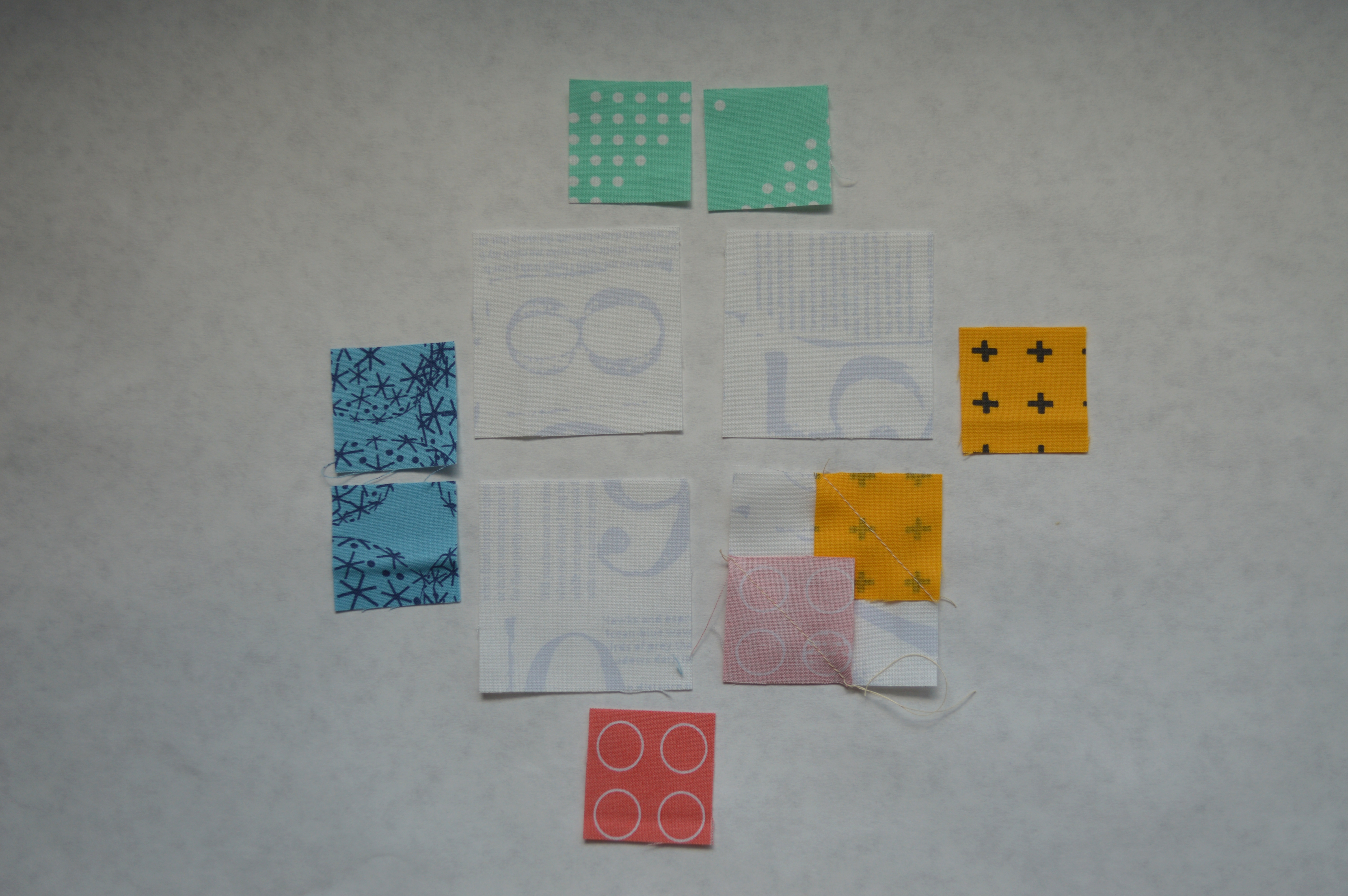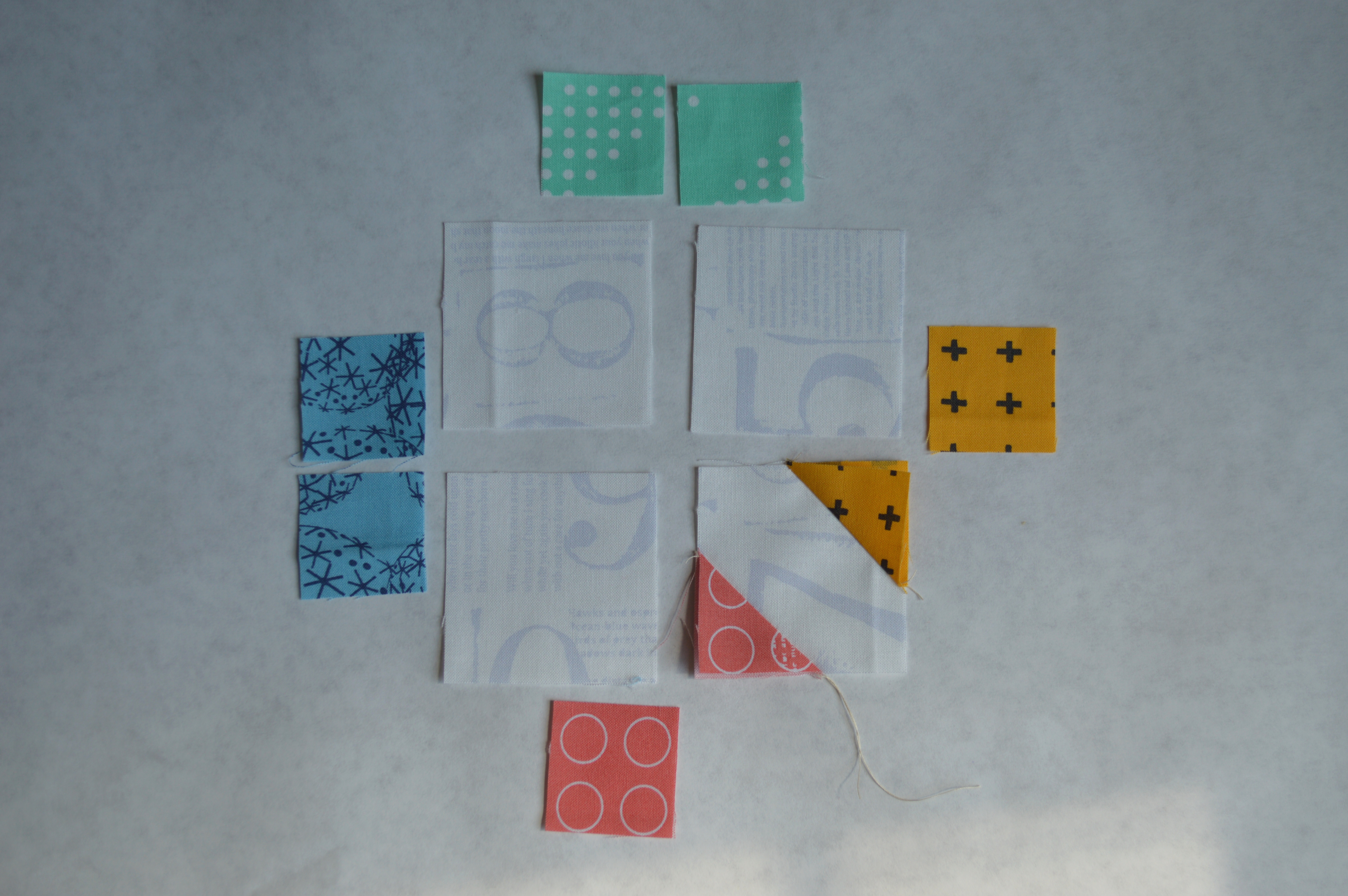 1. Arrange the four white squares in a four patch pattern on design surface. Each white square will have a small colored square sewn to the two opposite corners that finish on the edges of the block. See the photo above, the two colored squares of the same color must be sewn adjacent so they come together in the finished block.