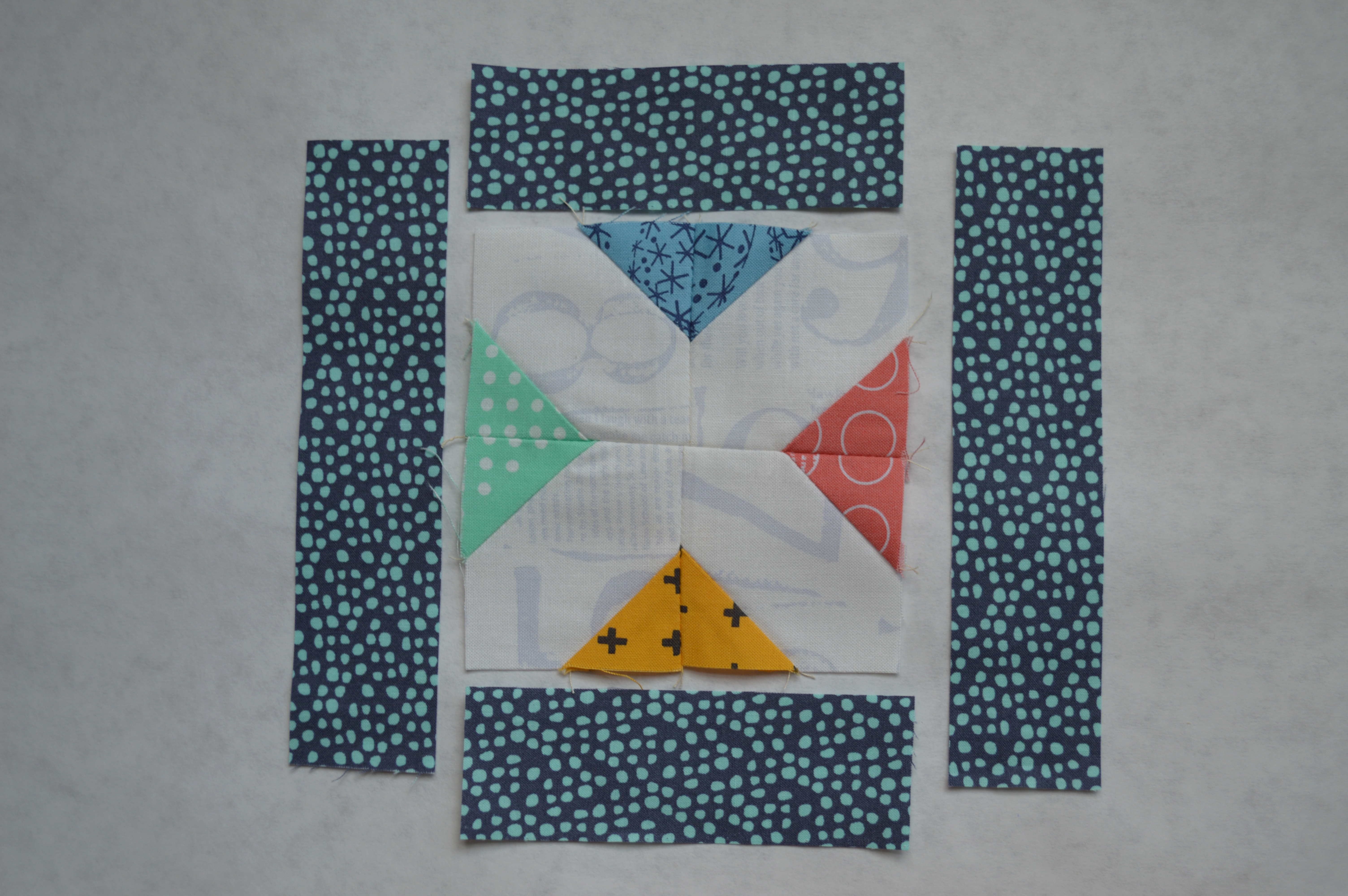 7. add the border strips: sew the 4 1/2″ strips first to opposite sides of the block. Press toward the strips.