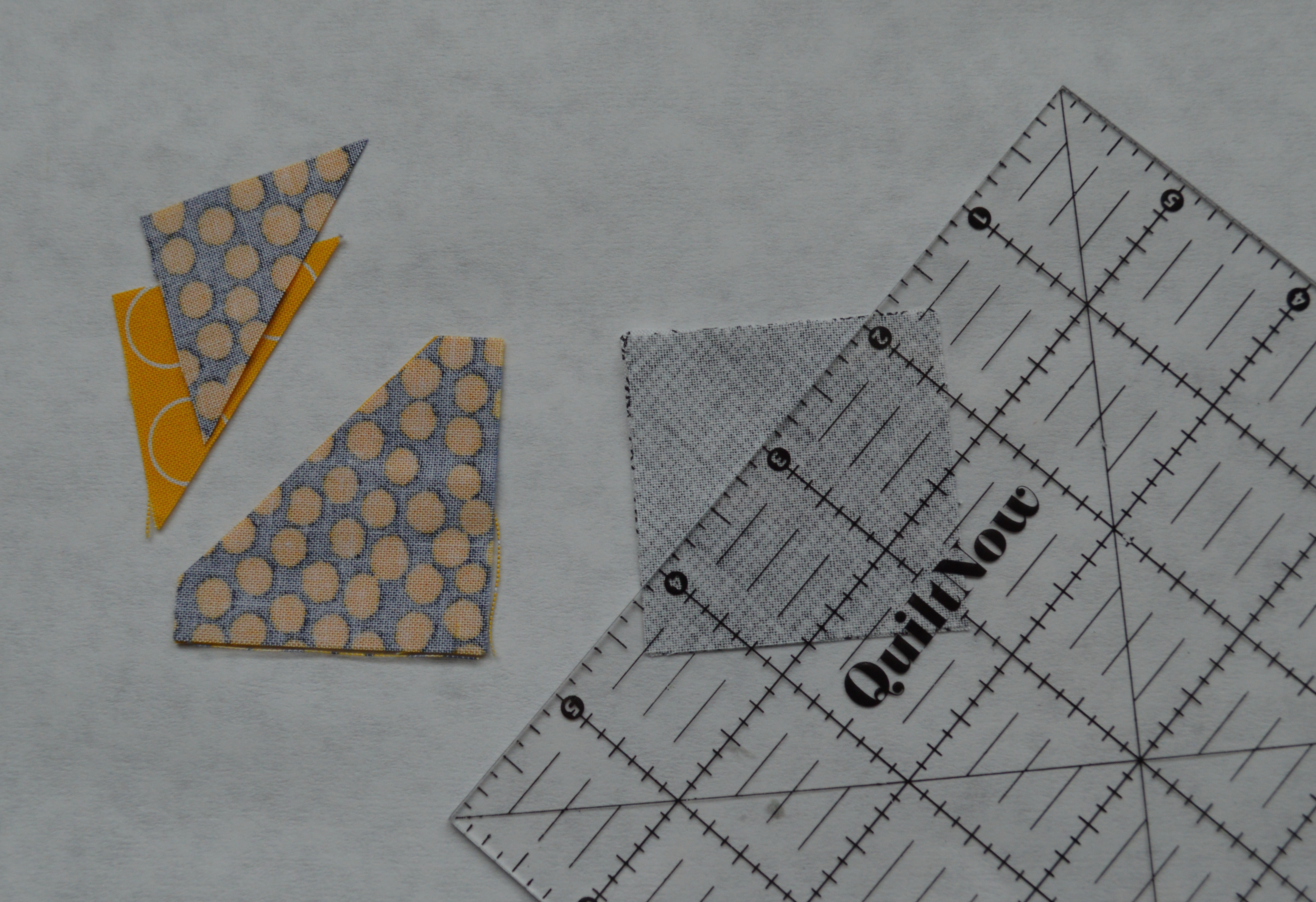 1. Match the light yellow/dark yellow squares right sides facing. Do the same for the dark/light black. Line up the 1/4″ line of your ruler with the corner/corner diagonal of the square as shown below: