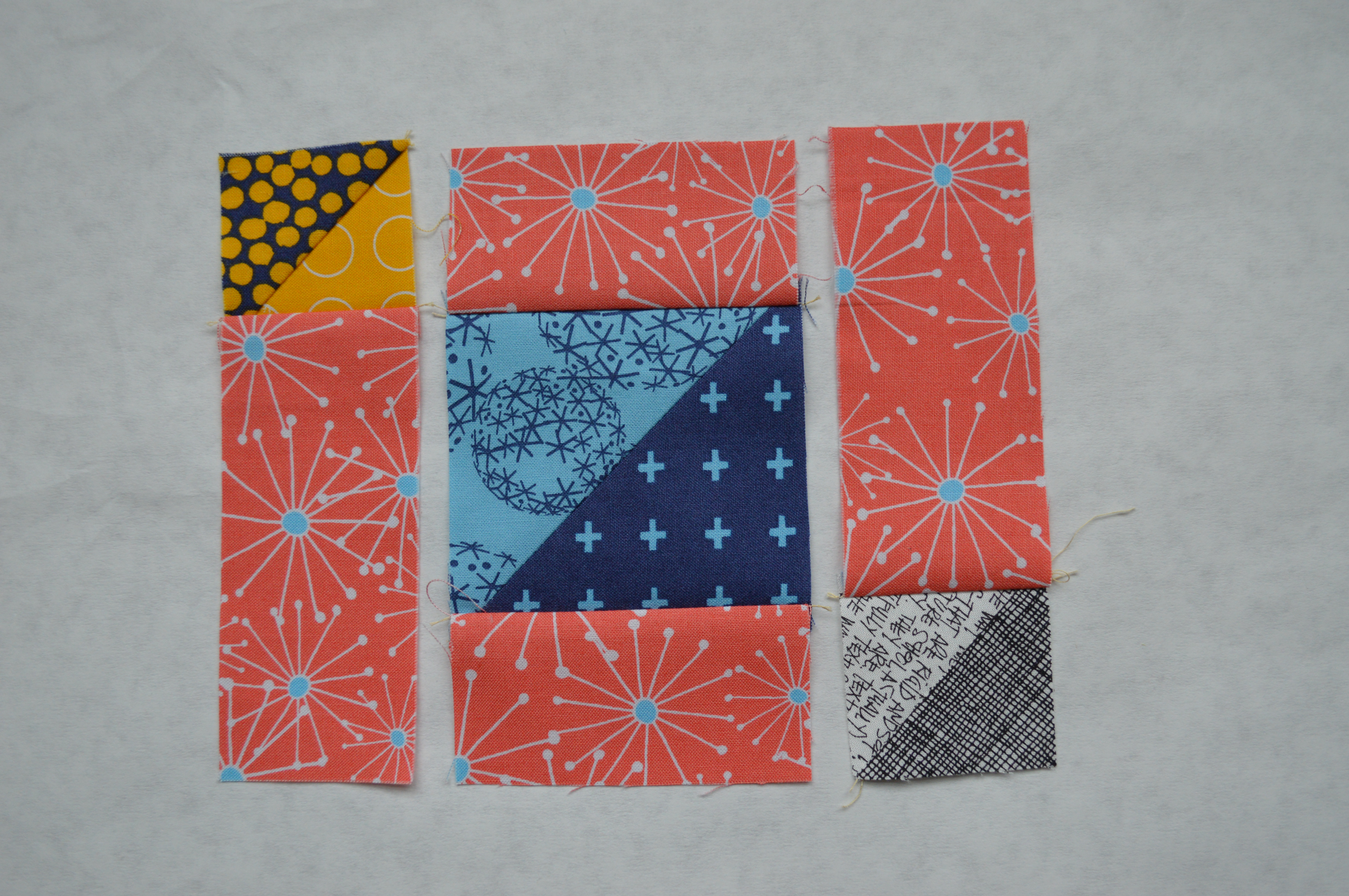 4. Arrange the HST units with the pink rectangles as shown above. Sew the 3 1/2″ pink rectangles to opposite sides of the blue HST unit. Press toward pink.
