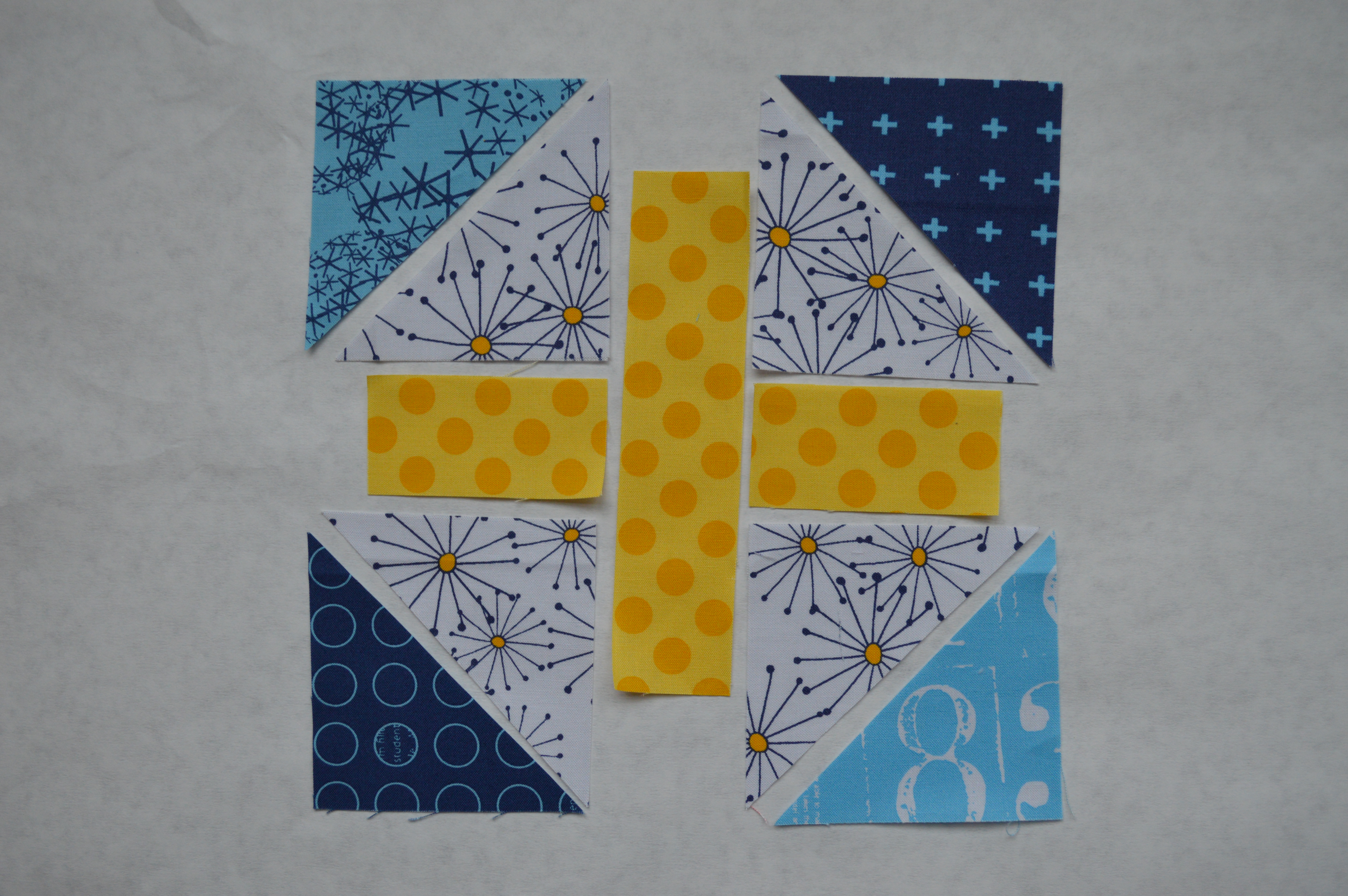 from each of the light and dark blue: (1) 3 1/2″ square, cut diagonally to yield two half-square triangles of each (HST). I used the leftover triangles from the last block and cut two more so they would all be different.