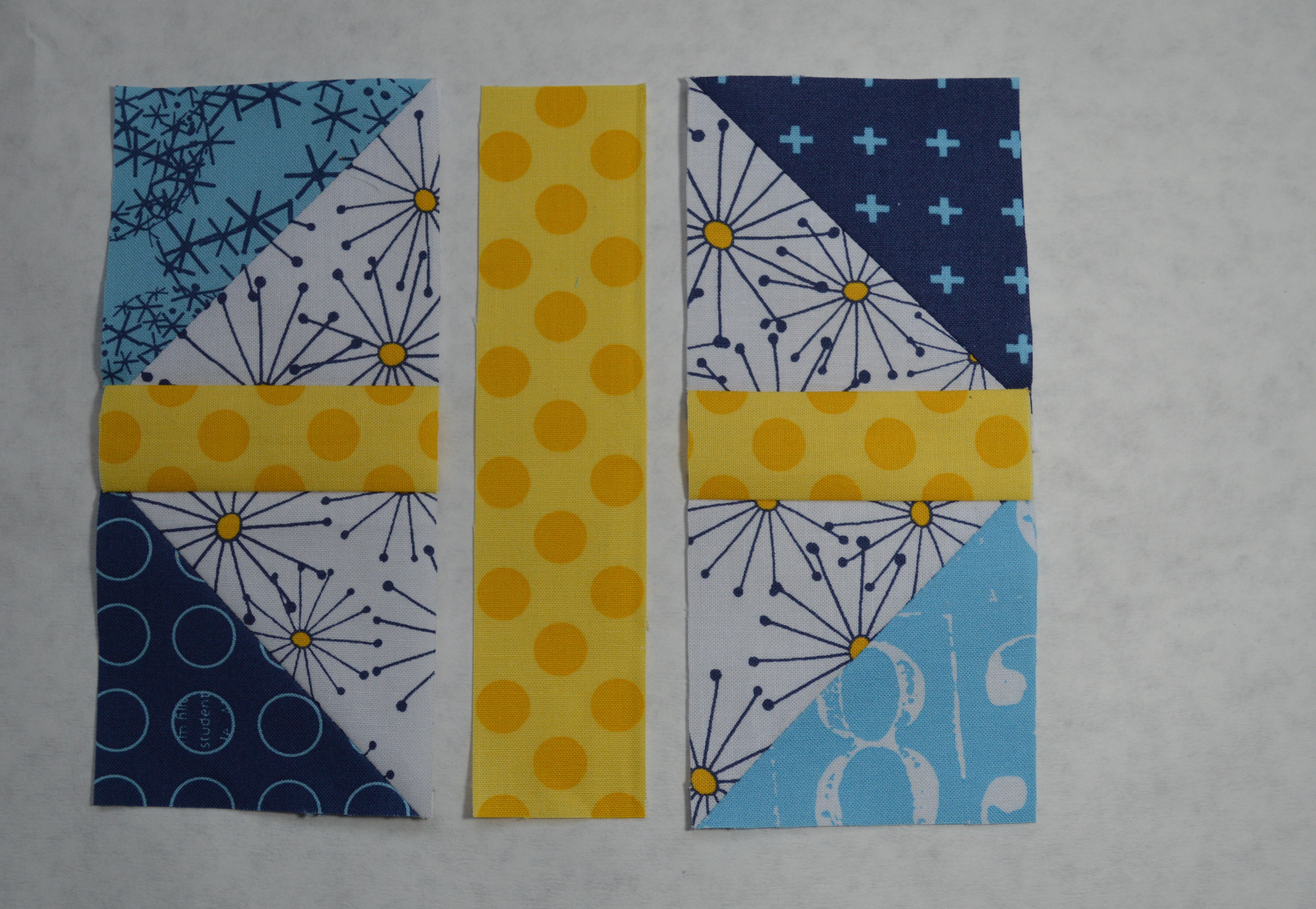 3. Sew the HST units on opposite sides of the 3 1/2″ yellow strips. Press toward the yellow.