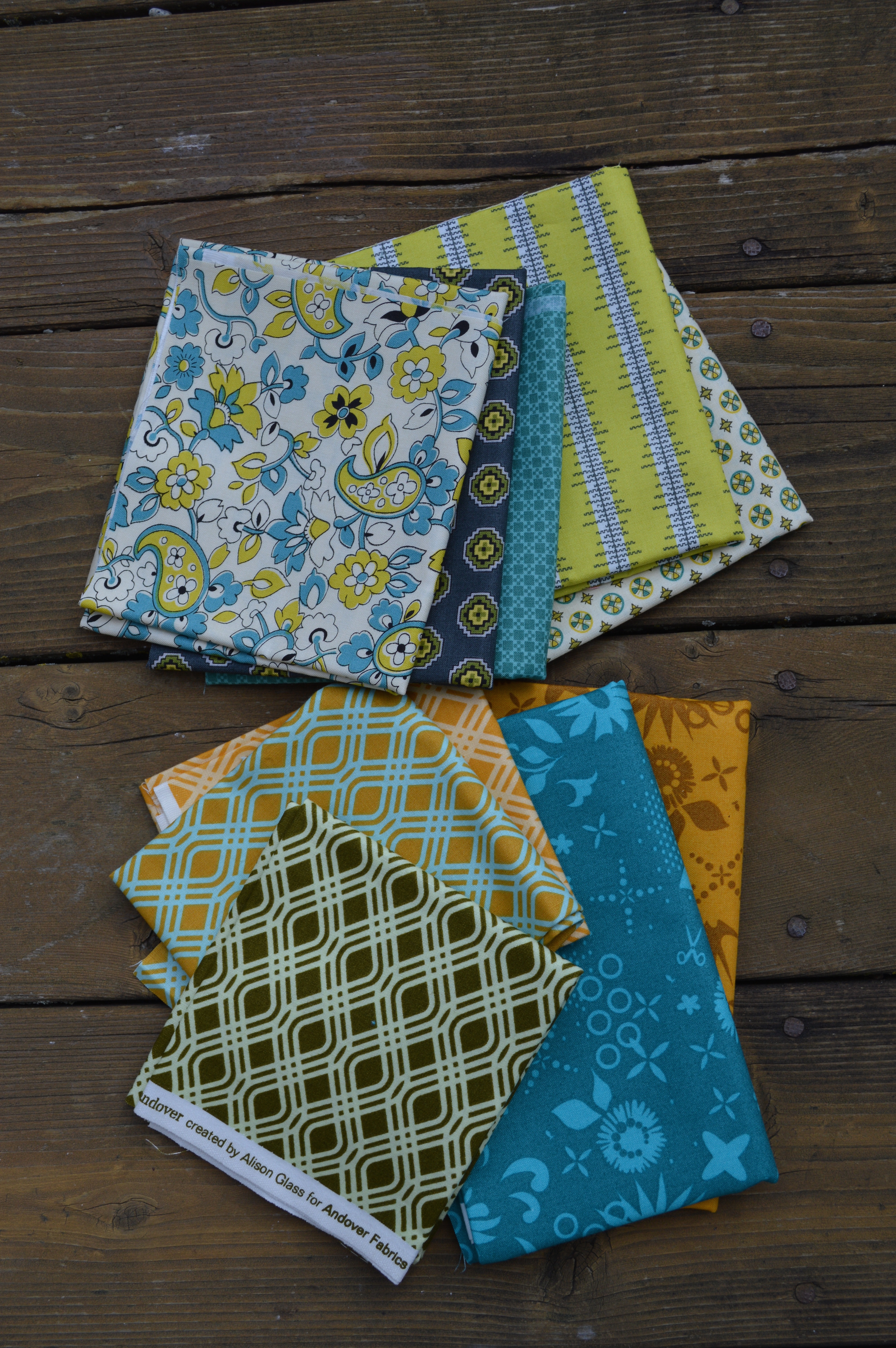 Another favorite: Sun Prints by Alison Glass. This was a series of prints released last year consisting of great blender prints. Just like the Chicopee fabrics, it comes in some pretty unique shades and color combinations (love that gold/baby blue streamer print!). I really like the turquoise from the Sun Prints and I threw in some gold for variety. I also like how the tonal Sun Prints provide a good contrast to the busy prints of Chicopee.