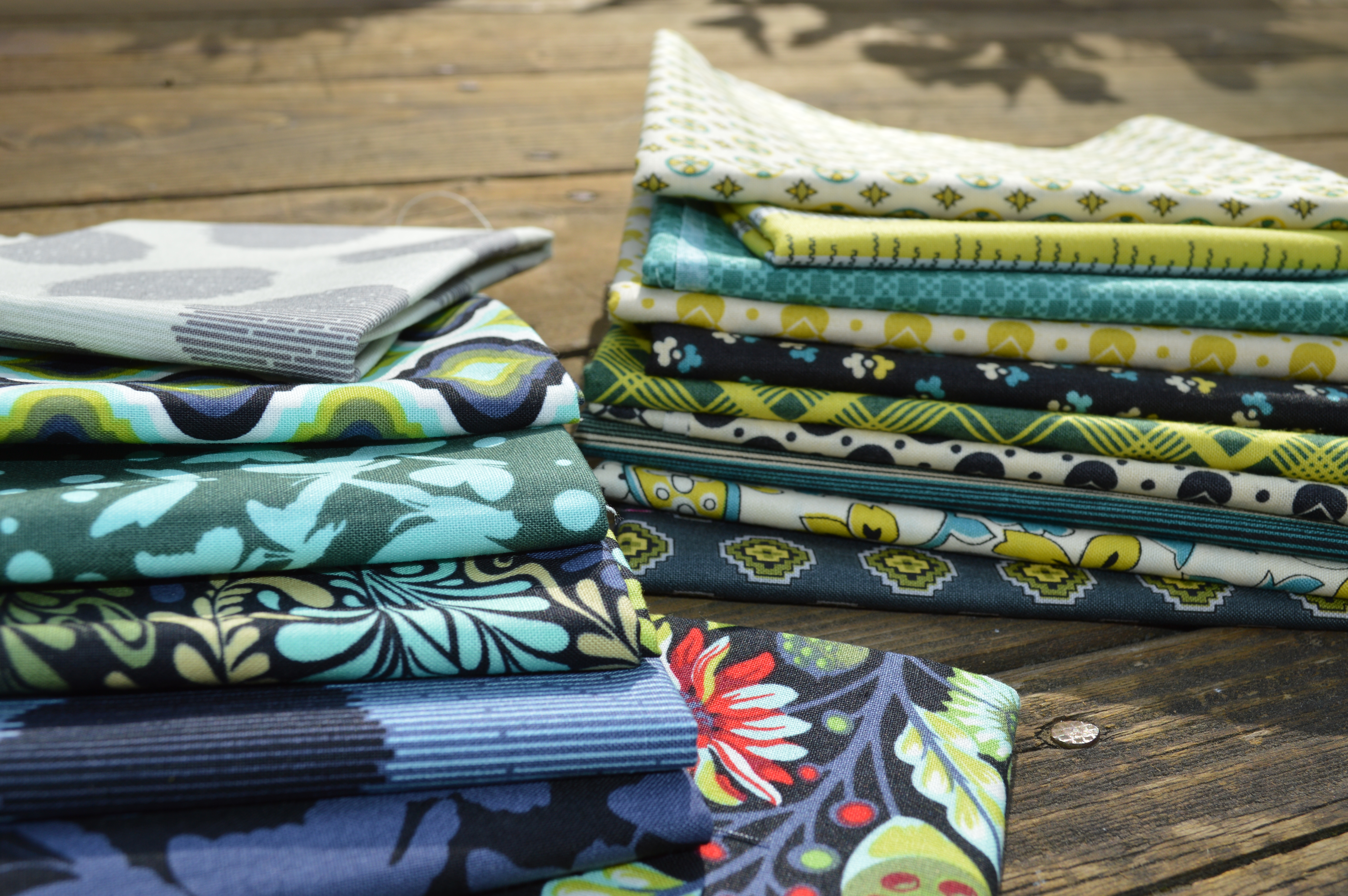 It is obvious that I love blue in all forms. Tula Pink has a new collection out called “Moonshine” that has an absolutely gorgeous blue color way of prints. While the blues in Moonshine are more navy or royal than the turquoise in Chicopee, when you add the chartreuse-lime green and the aqua blue, I think it all hangs together really well. I am thinking that all of these together, plus a light neutral (or dark navy! or bright chartreuse!) would make a really pretty “Dutch Windmill” quilt or “Star Crossed” quilt. Perhaps I can get this sewn up as an alternative to show when I get the Dutch Windmill pattern ready for my shop?